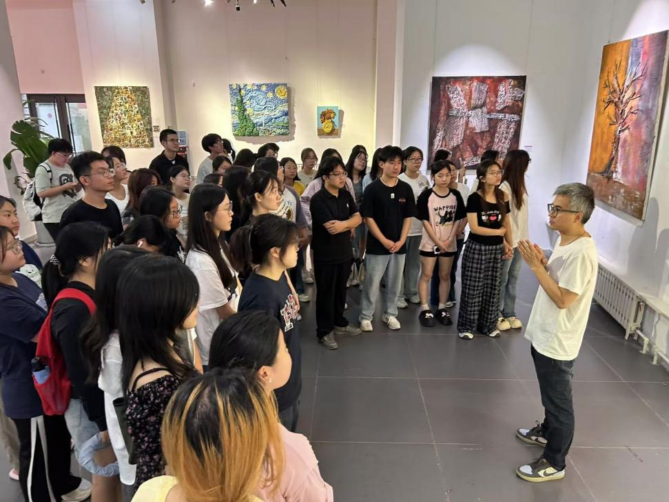 学生们全程认真聆听,讲解结束后同学们围绕画作驻足观赏,在古光辉老师的引导下,体悟综合材料碰撞出的艺术火花,现场交流氛围热烈。此次活动搭建起艺术实践与理论交流的桥梁,助力学生拓展艺术视野、提升创作认知,也彰显了新葡萄官网以艺术活动赋能人才培养,推动美育工作深入开展的积极成效。
