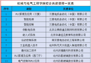 入选省级一流本科专业1个、校级一流本科专业1个、校级一流本科专业建设点1个,入选校级一流本科课程4门、校级课程思政示范课9门;立项建设市级技术创新中心1个;与地方产业园区合作建设校级“智能制造产业学院”,与三菱电机自动化(中国)有限公司共建“三菱电机”智能制造产业学院,为区域制造业培养复合型、应用型人才;校企共建实验室3个;在沧州及京津区域建设实习就业基地22家,合作、服务区域范围不断在扩展。