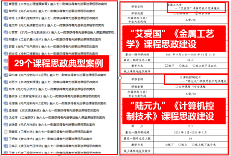 弘扬功勋模范精神。聚焦“七一勋章”获得者典型事迹,提炼其精神内核与思政元素,形成典型案例进教案、进课堂。《金属工艺学》课程以“做工人要做到最好”的艾爱国、《计算机控制技术》课程以自动化科学技术的开拓者之一的陆元九冠名课程思政示范课立项建设。打造《工业机器人技术》《自动控制原理》《数字电子技术》等9门课程思政示范课程,提升教师的课程思政建设能力。