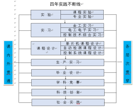 实施“321”项目层阶化实践教学,探索“工程实践+学科竞赛+职业资格证书”多元化协同实践培养模式。构筑一线(实践教育四年不断线)、两贯(课内外贯通、各层次贯穿)、八环节(实验、教学实习、生产实习、课程设计、毕业设计、学科竞赛、科技创新、社会实践)的实践教学体系。