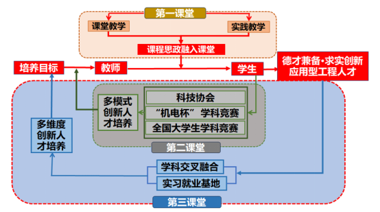 打造“强调基础与专业相结合、理论与实践相结合”的“第一课堂”;依托机电工程训练中心、创新实验室、三菱电机实验室等实践平台,采用“一二课堂贯通”模式,开展以实践创新能力训练、学科竞赛等为主要内容的“第二课堂”活动;以产教融合为支撑,依托智能制造产业学院和校外实践基地,创建工程意识养成,工程能力和工匠精神培养的“第三课堂”。“三课堂”融合人才培养模式初显成效。