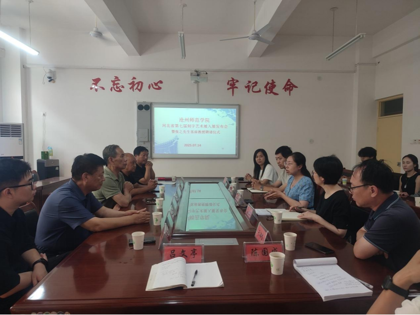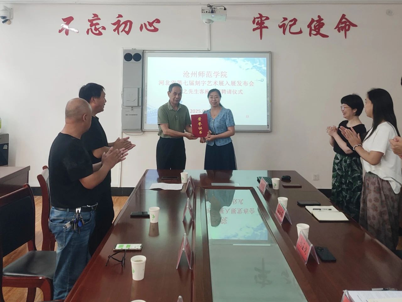 7月14日,新葡萄8883官网AMG河北省第七届刻字艺术展入展发布会暨张之先生客座教授聘请仪式在新葡萄8883官网AMG文学院举行,庆祝新葡萄官网书法学专业学生在河北省第七届刻字艺术展中取得佳绩。 中国书协刻字委员会原副主任张之,沧州市书协副主席兼秘书长冯子平,沧州市书协原副主席房世良,沧州市书协副秘书长黄子麟应邀参加发布会。新葡萄8883官网AMG党委常委、副校长郭玉秀,文学院院长王金萍,副院长孙玉安,书法学科负责人田雨潇、书法教研室主任刘晓霞与专任教师代表和获奖入展学生代表共同参加了此次活动。
