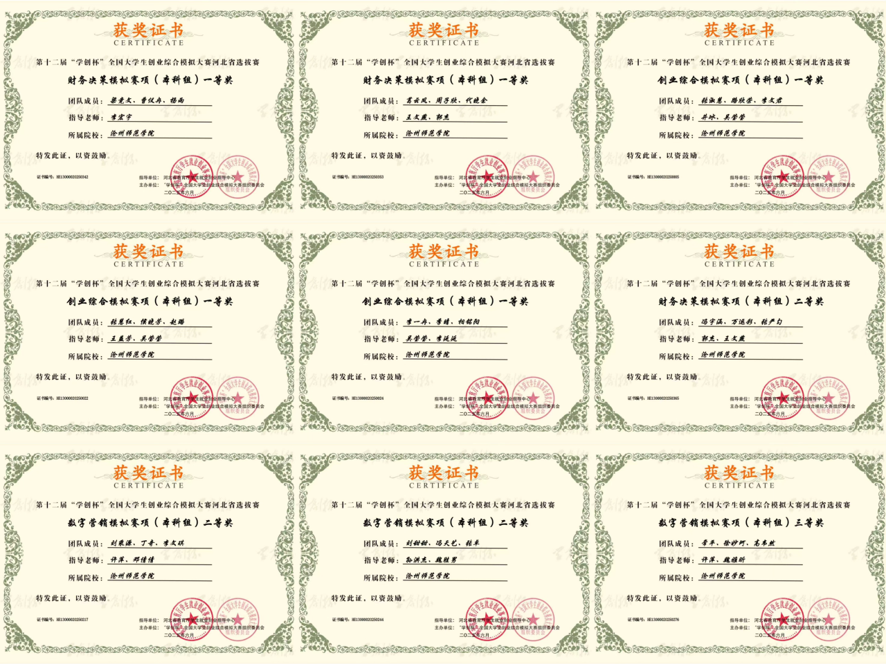 学校高度重视本届赛事,由大学生创新就业服务中心负责组织与指导,经过严格选拔,共派出由经济管理学院、商学院27名学子组成的9支代表队参赛,在创业综合模拟、数字营销模拟、财务决策模拟三个赛项中,新葡萄官网学子发挥出色,累计斩获一等奖5项、二等奖3项、三等奖1项。其中,3支优秀团队脱颖而出,将于9月代表河北省征战全国总决赛。