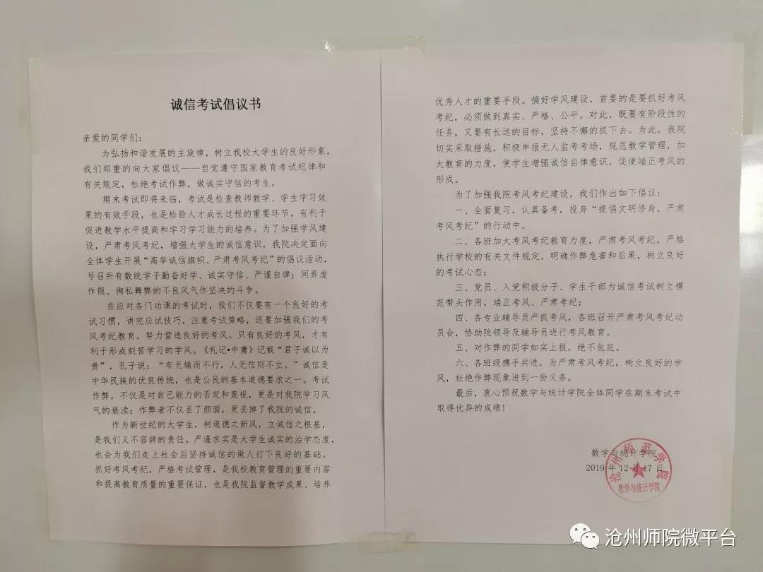 据悉,为营造公平、公正的考试氛围,以考风促学风,考试前,各学院通过召开诚信考试动员会、诚信考试主题班会、学生签订诚信考试承诺书、设置诚信考场等形式对学生进行了考前教育,教育学生诚信考试,抵制不良考风,杜绝舞弊行为。教务处采取实地巡考和网上巡考相结合的方式,对考试全过程进行巡查;各学院成立了院级巡查组;部分学院在考场外设置了考生服务处,在考场内安放了手机置物袋,这些措施的实施,有效增强了学生诚信考试的意识,确保了良好的考试秩序。
