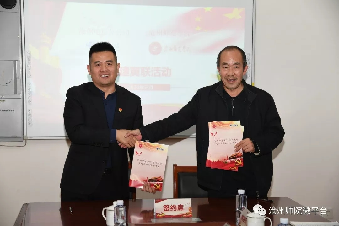 党委副书记王双库代表中共新葡萄8883官网AMG委员会与中共中国电信沧州分公司委员会签署党建翼联合作协议书。为下阶段双方共同推进党建工作、共同履行社会责任、进一步深化校企合作奠定基础。