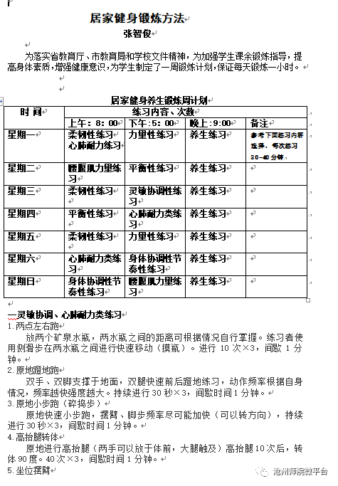 每位任课教师根据自己选项课的特点,为学生制定了每天的运动健身计划。即使不能面对面交流,学生在家也可以根据自身情况进行体育锻炼,达到增强免疫力、强身健体的目的。