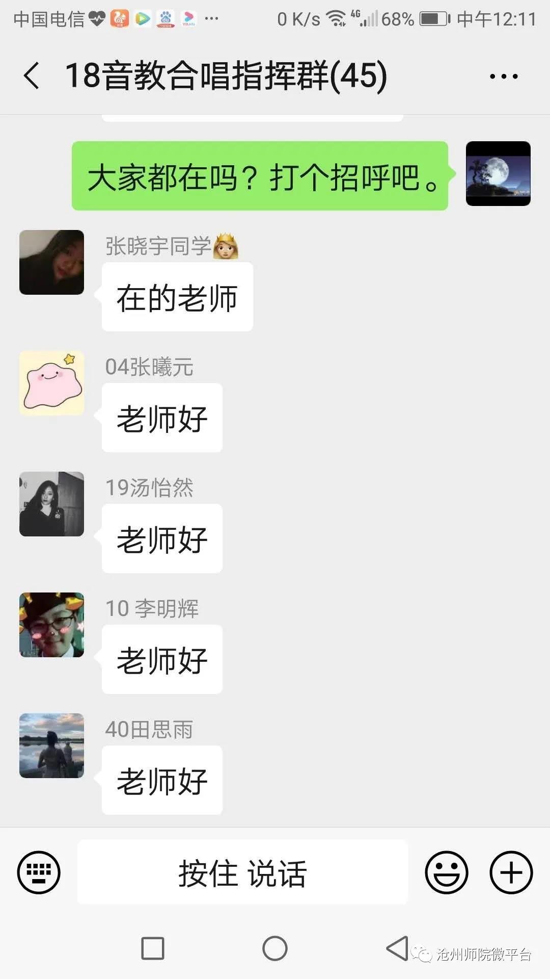结合专业特色,将课堂主阵地转移到了微信这一简单高效的社交软件上。一条条的音频,一段段视频,这就是生动活泼的音乐课堂,在快乐中学习,在快乐中收获。