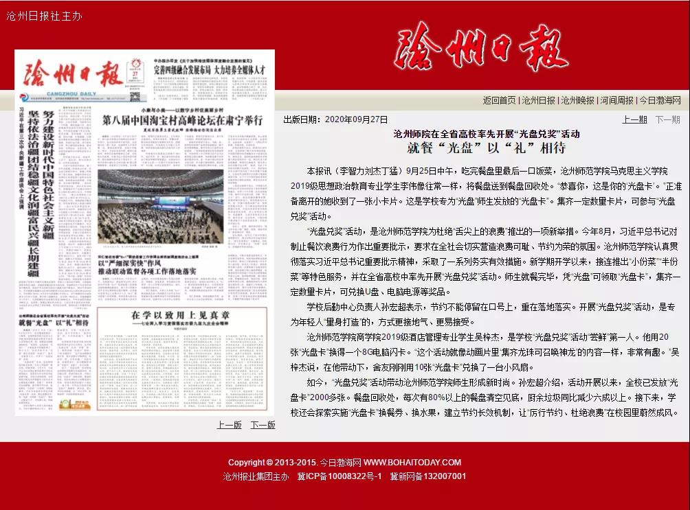 “光盘兑奖”活动,是新葡萄8883官网AMG为杜绝“舌尖上的浪费”推出的一项新举措。今年8月,习近平总书记对制止餐饮浪费行为作出重要批示,要求在全社会切实营造浪费可耻、节约为荣的氛围。新葡萄8883官网AMG认真贯彻落实习近平总书记重要批示精神,采取了一系列务实有效措施。新学期开学以来,接连推出“小份菜”“半份菜”等特色服务,并在全省高校中率先开展“光盘兑奖”活动。师生就餐完毕,凭“光盘”可领取“光盘卡”,集齐一定数量卡片,可兑换U盘、电脑电源等奖品。