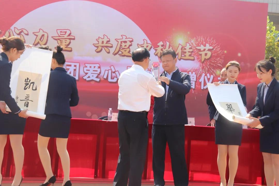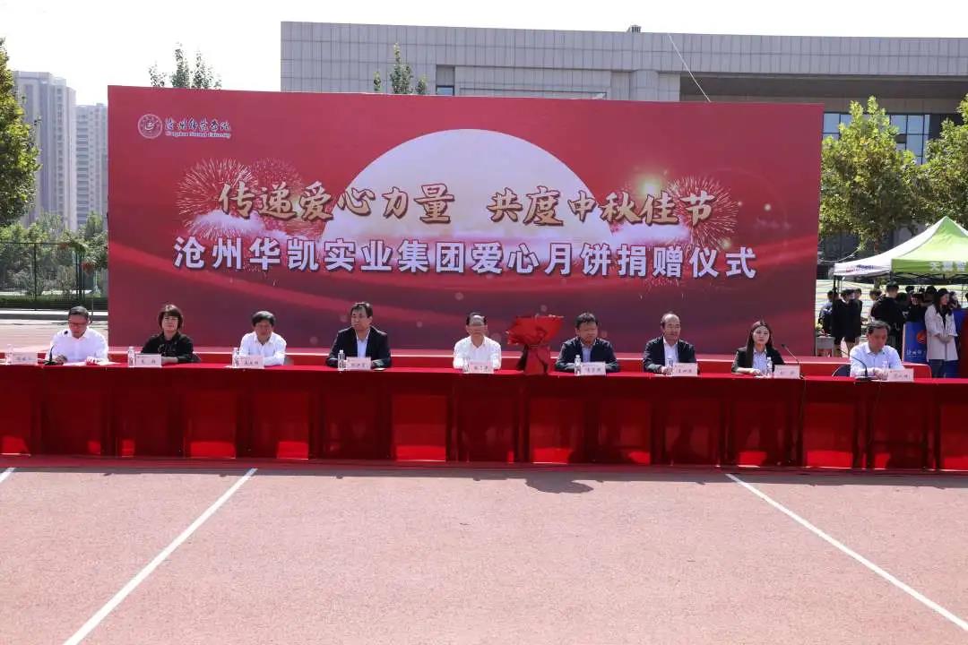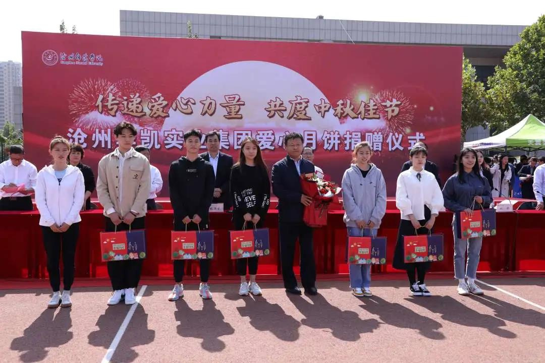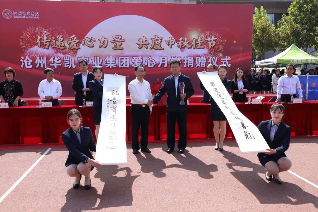 在运动会闭幕式后,还有贴心大礼包。华凯集团董事长肖玉洪先生一行在中秋节佳节之际到新葡萄官网慰问同学们,给同学们带来了美好的节日祝福和中秋礼品。16000个月饼和水果准时送达学生手中,沉甸甸的爱心使欢乐的海洋增添了温情。校长张占平赠送了感谢奖杯和对联,合作共建的友谊将续写华章。