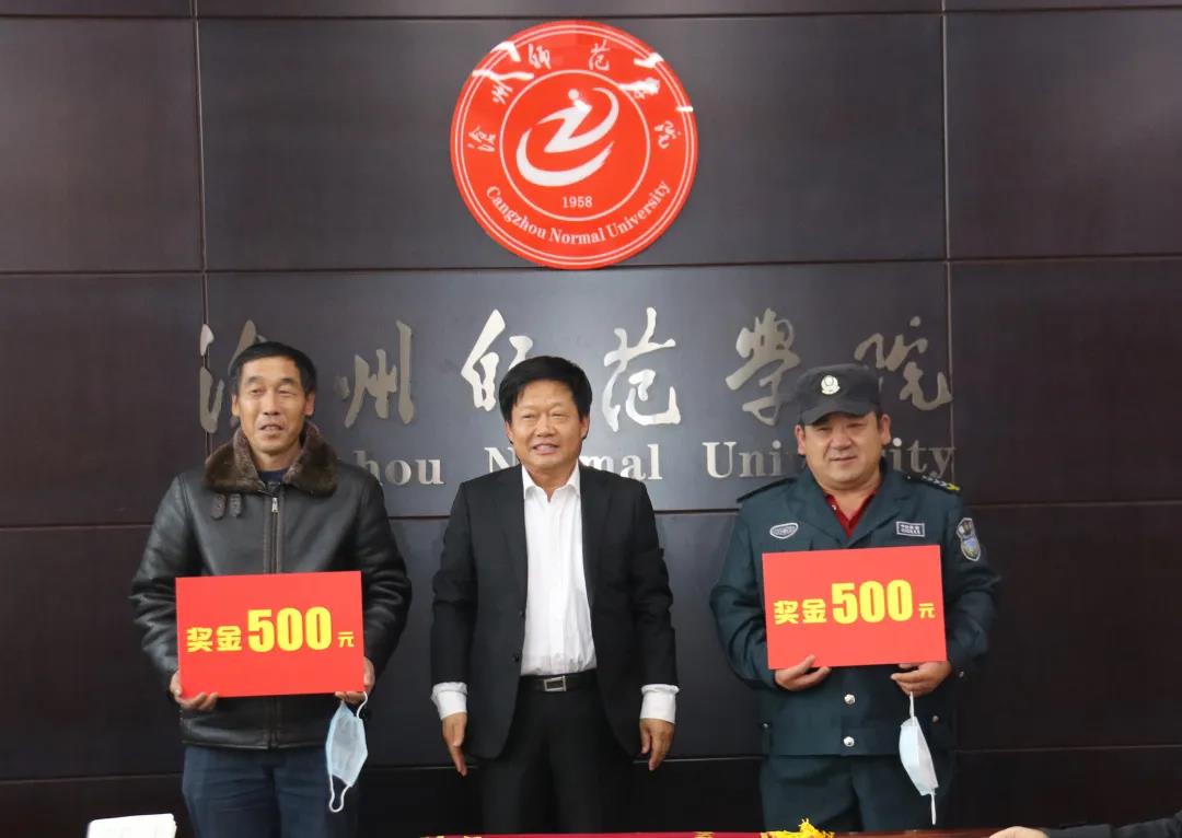 11月25日下午,“吴国勇、周春国见义勇为表彰会”在图书馆八楼会议室召开,党委副书记姜忠明出席并为见义勇为跳水救人的吴国勇、周春国两位同志颁发奖金。被救学生所在学院的负责人向两位同志敬献了锦旗。