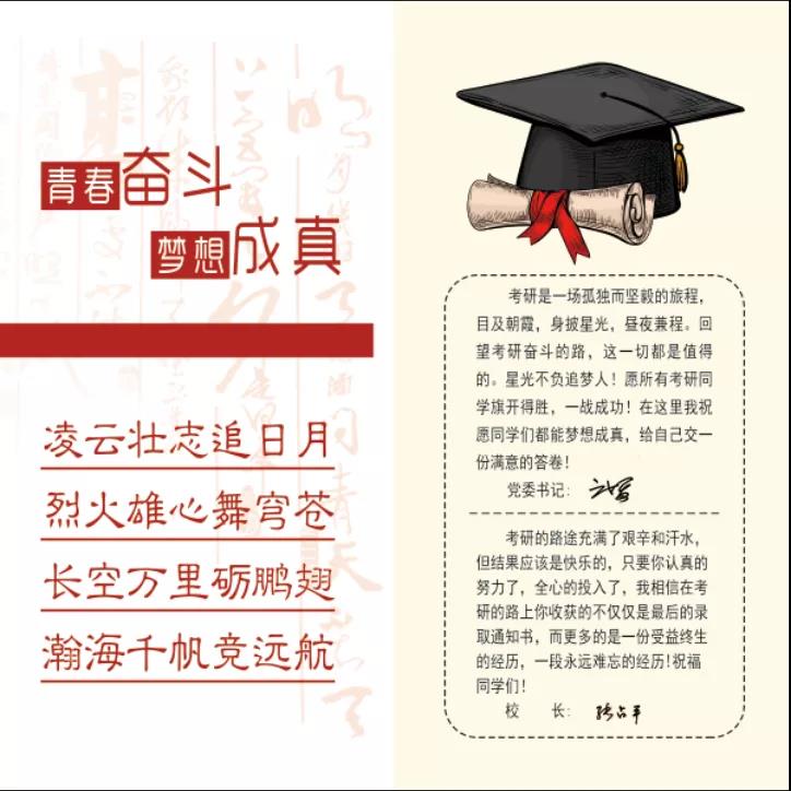 考研路上你们披星戴月,风雨无阻,为梦想而拼搏,为梦想而起舞,星光不问赶路人,时光不负有心人,此刻的你们或信心百倍或焦虑紧张,但请相信,坚持已是最大的胜利,学校是你温暖的港湾!