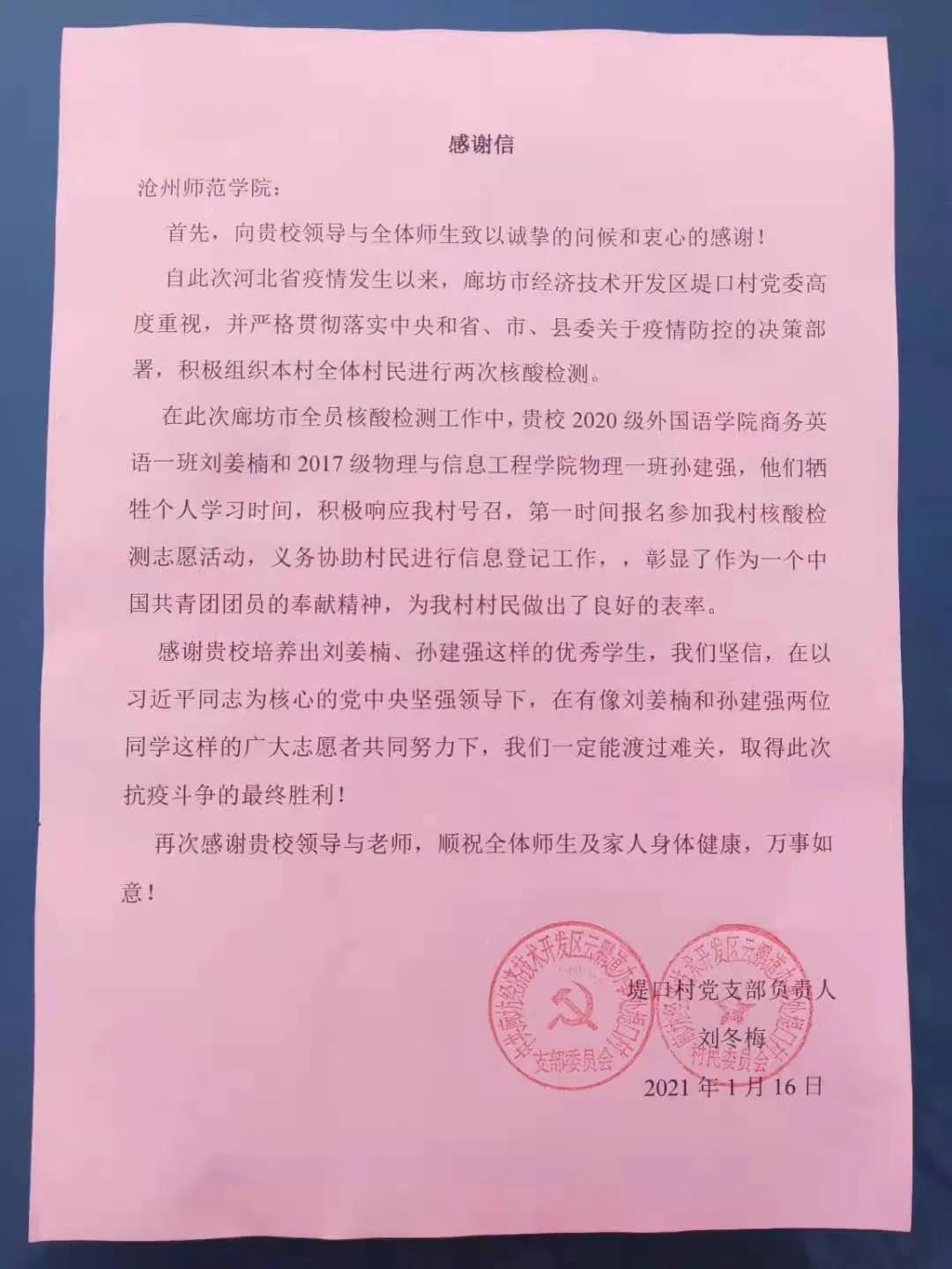 日前,根据廊坊市疫情防控政策需要,需要马上进行第一轮核酸检测。由于该市堤口村防疫任务繁重,村委会专门开展了核酸检测志愿者征集活动。知悉后,孙建强、刘姜楠两位同学毫不犹豫地报名参加,义务协助村民进行信息登记工作。他们严格要求自己,服从组织安排,在实际行动中为村民做出了良好的表率,彰显了新时代大学生无私奉献的精神。两名学生在志愿工作中表现优秀,收获了邻里乡亲的赞扬,村委会专门致信新葡萄官网表达感谢。
