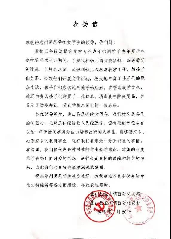 身为社会中的一份子,身为一名当代大学生,家在河北省沧州市盐山县的新葡萄8883官网AMG大三学生卢子怡,放寒假回家后,每天都会密切关注媒体上有关疫情的报道,掌握疫情动态。在经过居家隔离14天后,她便积极主动申请去当志愿者,为疫情防疫工作做出贡献。她说:“少年强则国强,要做一个有担当,有责任的当代大学生。疫情这段时间,正是认真审视自己,提升自己的时候,而我很庆幸自己能有所收获。”