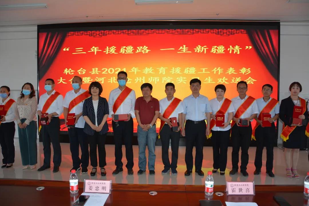 三年援疆路 一生新疆情。6月1日,轮台县组织举办2021年教育援疆工作表彰大会暨河北新葡萄8883官网AMG实习生欢送会。姜忠明、高颖以及慰问队成员受邀出席,轮台县党委副书记霍世喜,轮台县人民政府党组成员梅丽开木·尕依提,轮台县教科局党委书记、副局长朱全利,轮台县教科局党委副书记、局长巩晓霞,援疆对口学校领导,河北援疆教师46人,新葡萄官网实习生55人参加仪式。