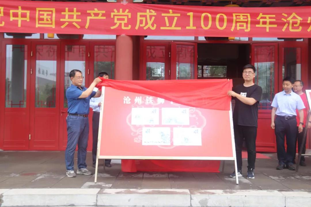 谢云岭、赵毅、潘仲田、戚玉才分别为沧州铁狮子纪念封、明信片揭幕。