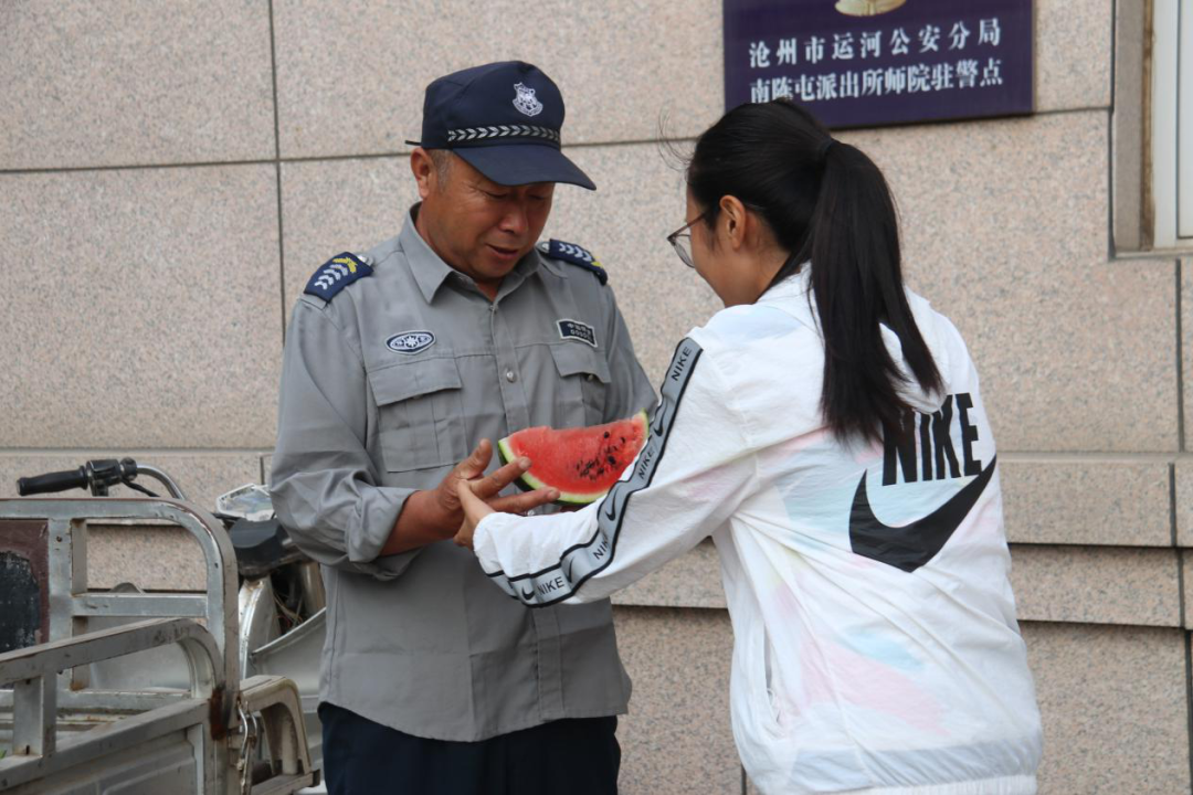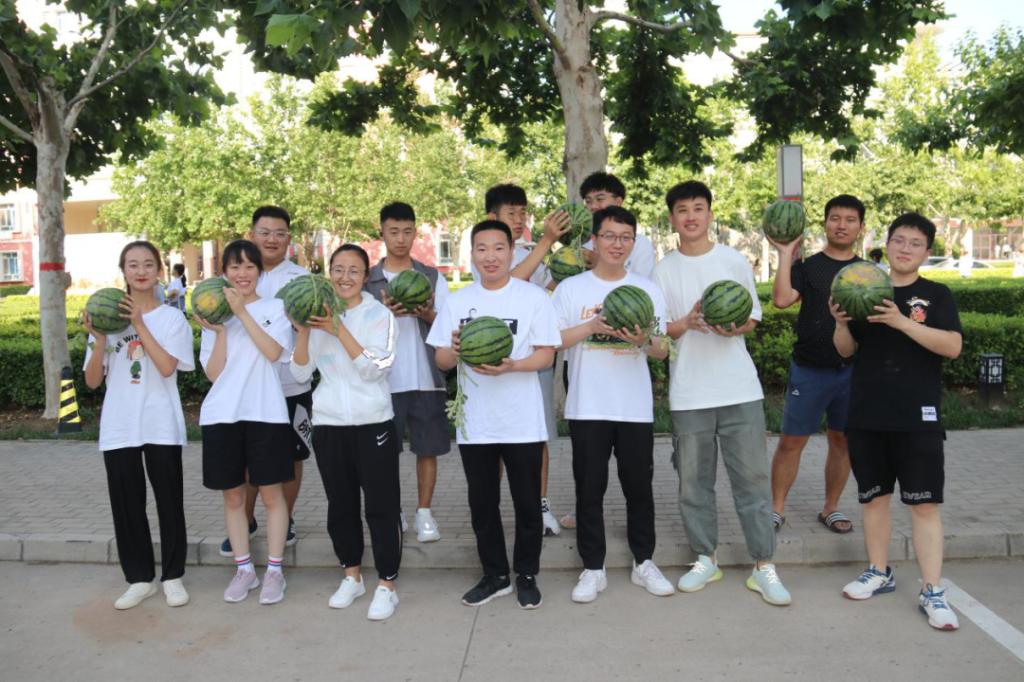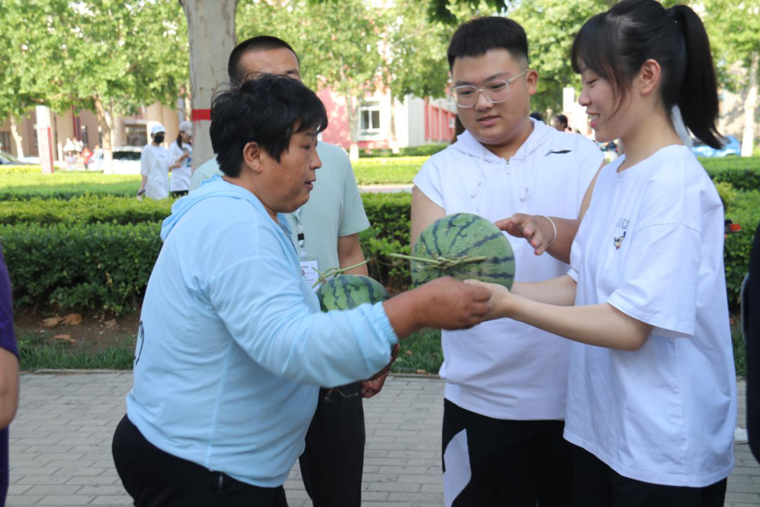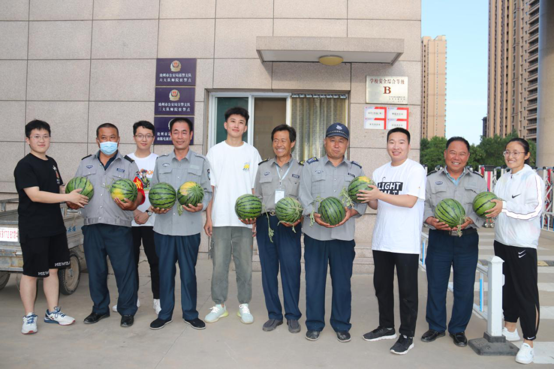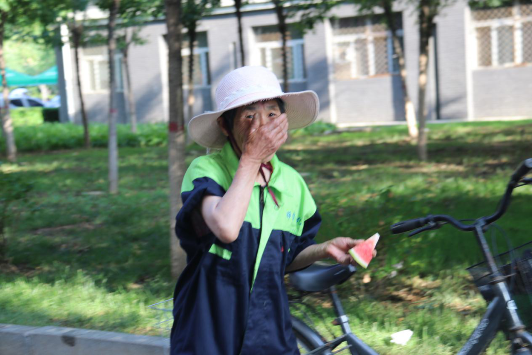 6月15日,在新葡萄官网2021届毕业生离校前夕,他们将这份感动和感恩化为实际行动。来自各学院的17名毕业生代表“偷偷地”为这些照顾他们日常生活的宿管阿姨、门卫大叔以及保洁员等准备了一大筐西瓜。这份临行前的礼物,甜到了每个人的心坎上。体育学院毕业生刘孝凤说:“真舍不得这些叔叔阿姨们,感恩他们家人一般的照顾。希望一块西瓜能为他们消消暑,照顾我们四年,辛苦啦!”