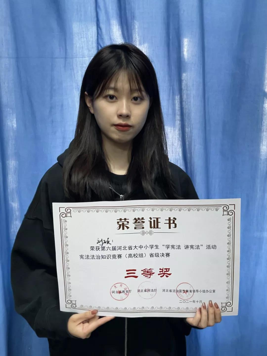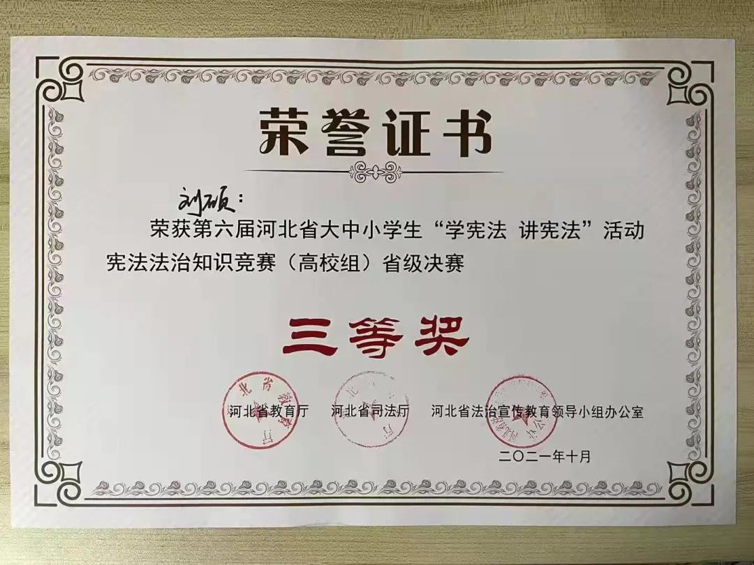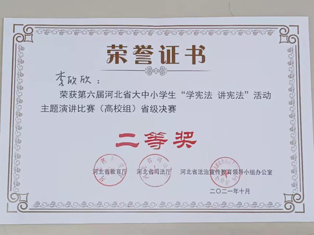 10月12日,为期两天的第六届河北省大中小学生“学宪法,讲宪法”大赛在河北师范大学正式落下帷幕。凭借对宪法知识的深入了解和良好的现场变现,新葡萄官网齐越传媒学院学生李欣欣和马克思主义学院学生刘硕分别在“学宪法,讲宪法”活动主题演讲比赛(高校组)和“学宪法,讲宪法”活动宪法法治知识竞赛(高校组)中获得二等奖和三等奖。