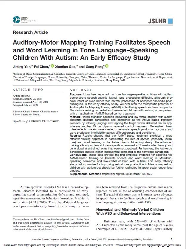 近日,新葡萄官网阎锦婷博士的语音学研究团队在SSCI语言学一区期刊Journal of Speech, Language,and Hearing Research上发表了论文《Auditory-Motor Mapping Training Facilitates Speech and Word Learning in Tone-Language-Speaking Children with Autism: An Early Efficacy Study》。该研究受校内科研基金重点项目“基于APP的自闭症儿童言语习得音乐疗法研究”等资助。