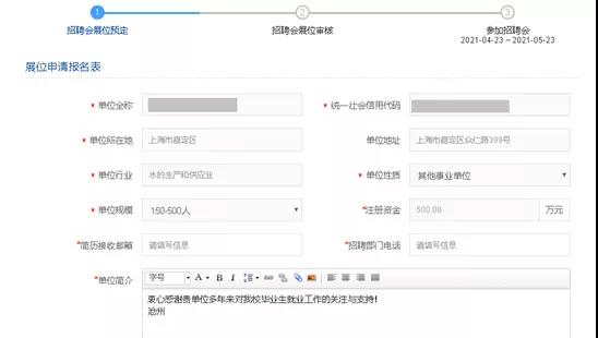1. 学校将根据报名情况对报名参会企业进行筛选审核,审核未通过系统会自动下线展位信息,敬请理解。