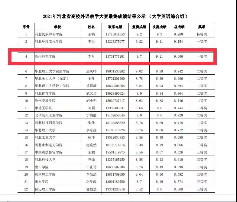 日前,在刚刚结束的2021年河北省高校外语教学大赛中,新葡萄官网外国语学院青年教师李月、张雪冰分别取得大学英语组一等奖及专业组二等奖的优异成绩。