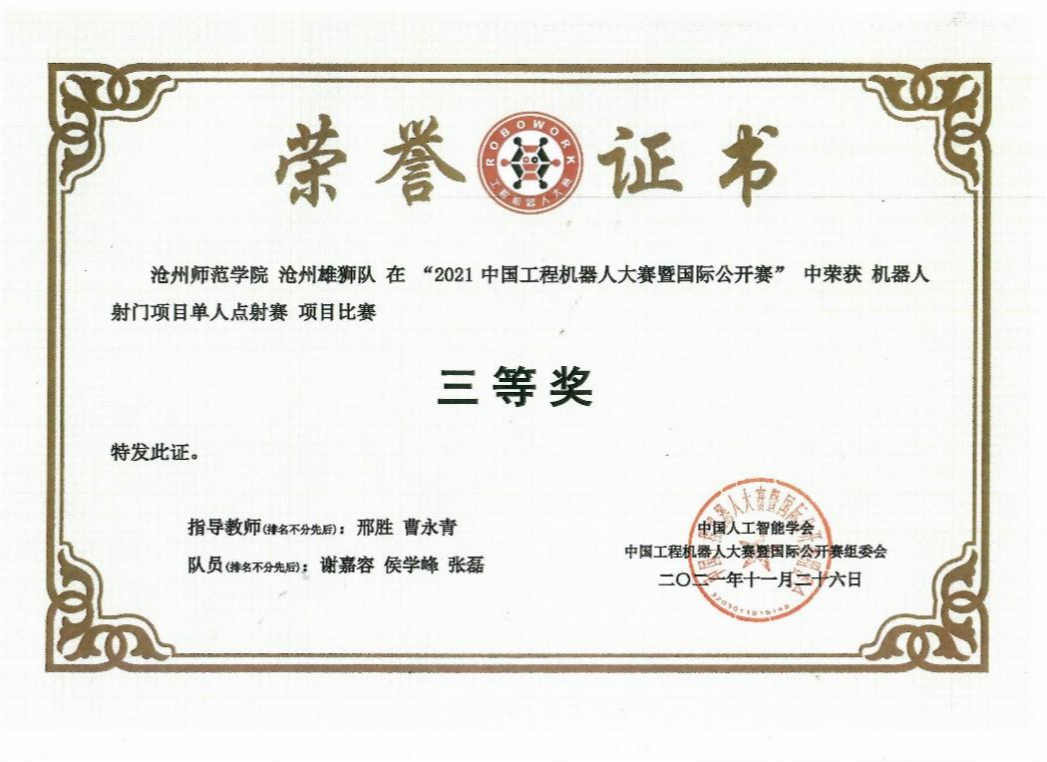 2021年7月,由中国人工智能学会主办的中国工程机器人大赛暨国际公开赛顺利举办,新葡萄官网计算机科学与工程学院选送的“沧州雄狮”团队在此次比赛中荣获三等奖。本次赛事吸引了全国超过300所高校,3000余支参赛队伍。