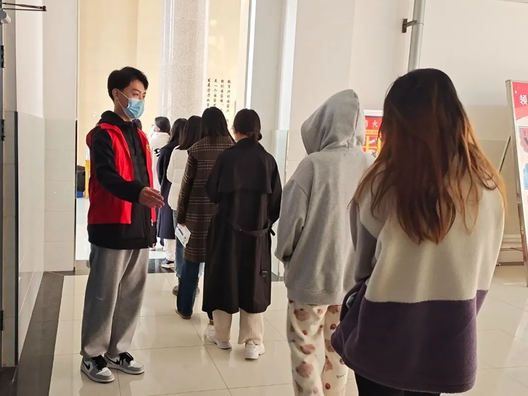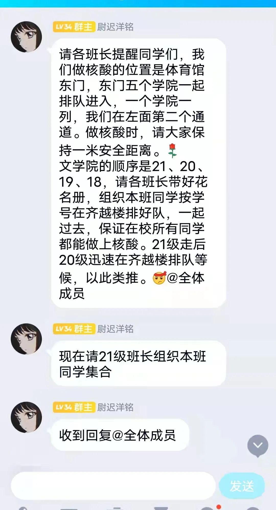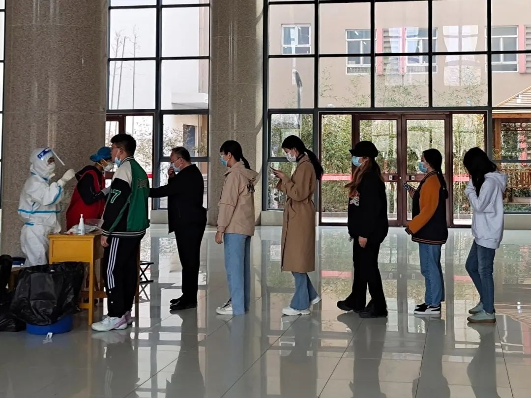 文学院院长王金萍、党总支书记孔令升与各位辅导员老师冲在疫情防控第一线,亲临核酸检测现场指导工作,按照分批、分时间段的原则,以年级、班级为单位,督促学生错时错峰采样。学生志愿者们也早早地来到了核酸检测点,维护核酸检测现场秩序,辅助医护人员顺利开展工作,充分发挥模范带头作用。在学院领导、老师以及团总支、学生会学生干部的协调联动下,该院两次核酸检测顺利有序地完成。
