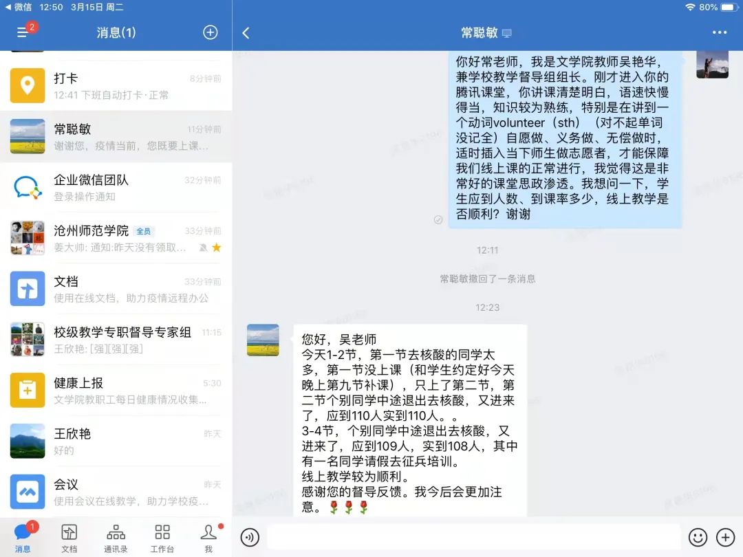 以吴艳华组长为首的校级专职督导组迅速转变线下督导方式,与教学质量监控中心工作人员密切沟通联系,调试教学软件,更换浏览器,短短时间就掌握了雨课堂、学习通、腾讯会议、腾讯课堂等线上教学督导手段。