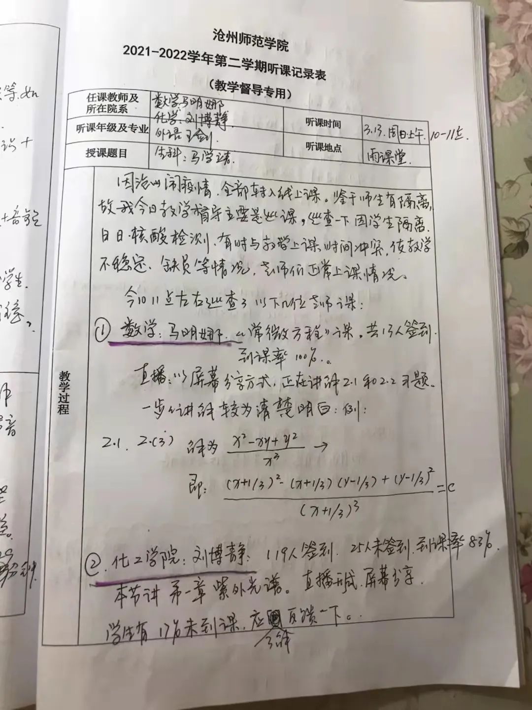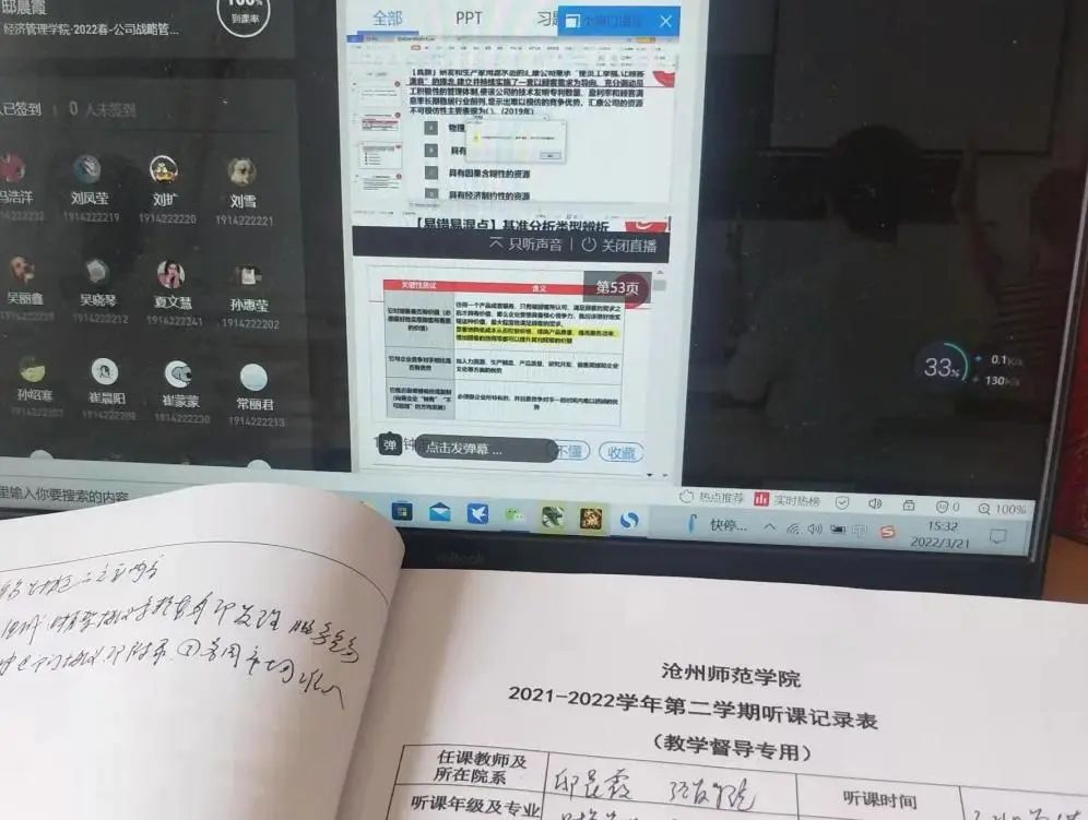 他们进入教学督导平台巡课、听课,一页又一页听课记录,密密麻麻的字里行间满含着几位专家对学校线上教学质量的关切和期望。他们的敬业精神,他们的默默坚守,他们对师院的挚爱就在这些坚毅的身影和紧盯屏幕的专注目光中得到了淋漓尽致的诠释!
