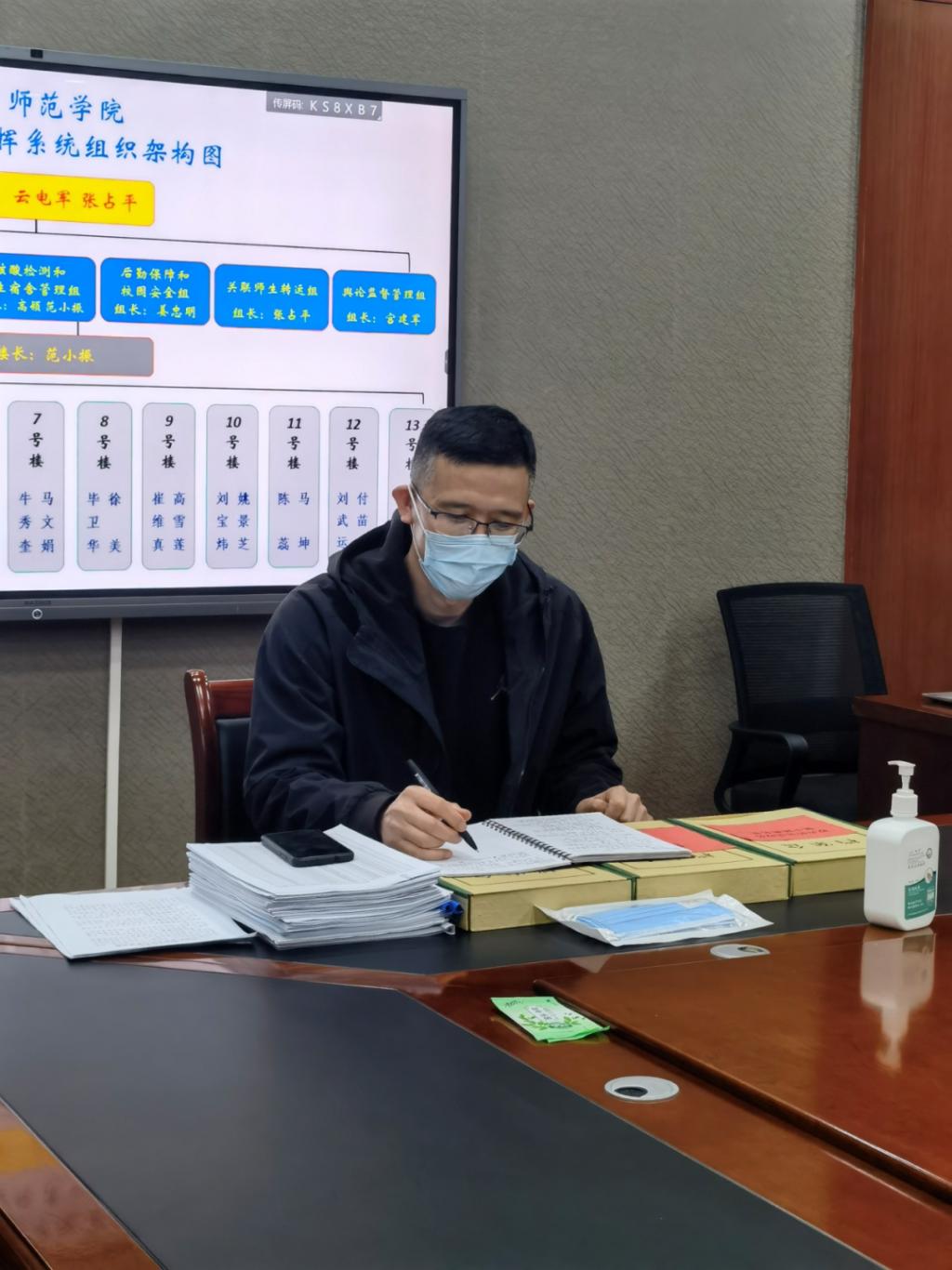 他主动投身一线、亲力亲为,毫不放松抓紧抓实抓细各项工作,每天扑在工作上。在办公室里,他组织会议、上传下达、协调各方、起草文稿;在宿舍、学院,他组织落实、调研情况、督查督办……常常统筹协调办公室和学校抗击疫情各项工作到深夜,有时凌晨接到电话也要马上部署安排有关工作,天泛起蒙蒙亮的时候又埋首在办公桌前工作。笔耕不辍、步履不停,他说:“这都是应该的。”