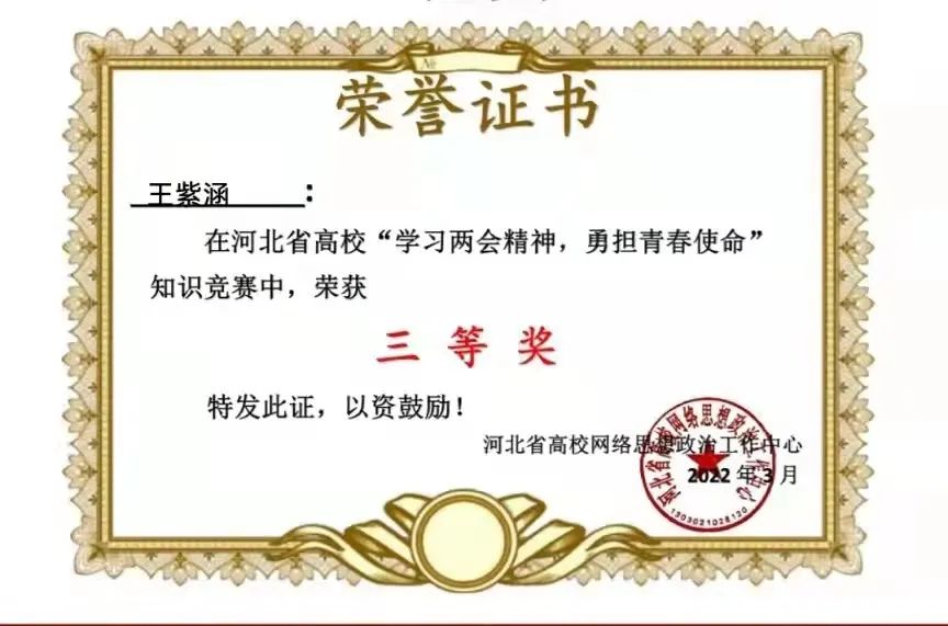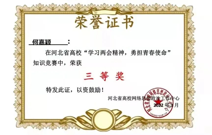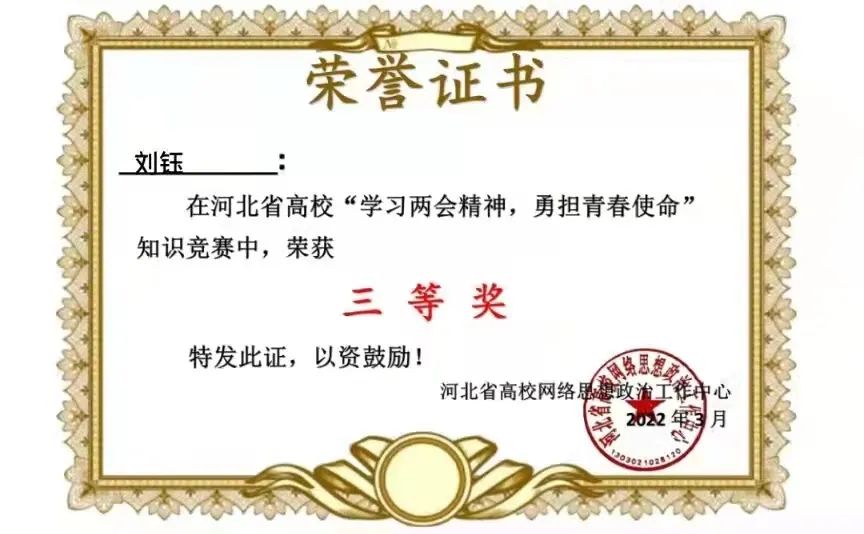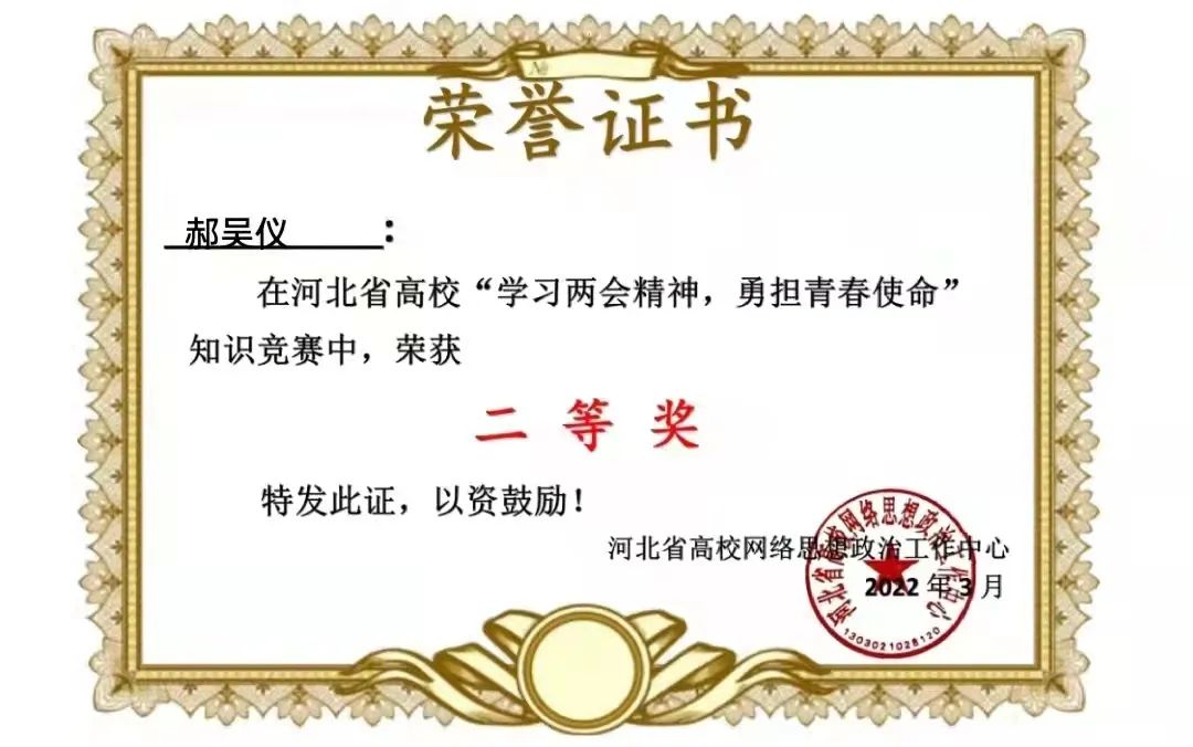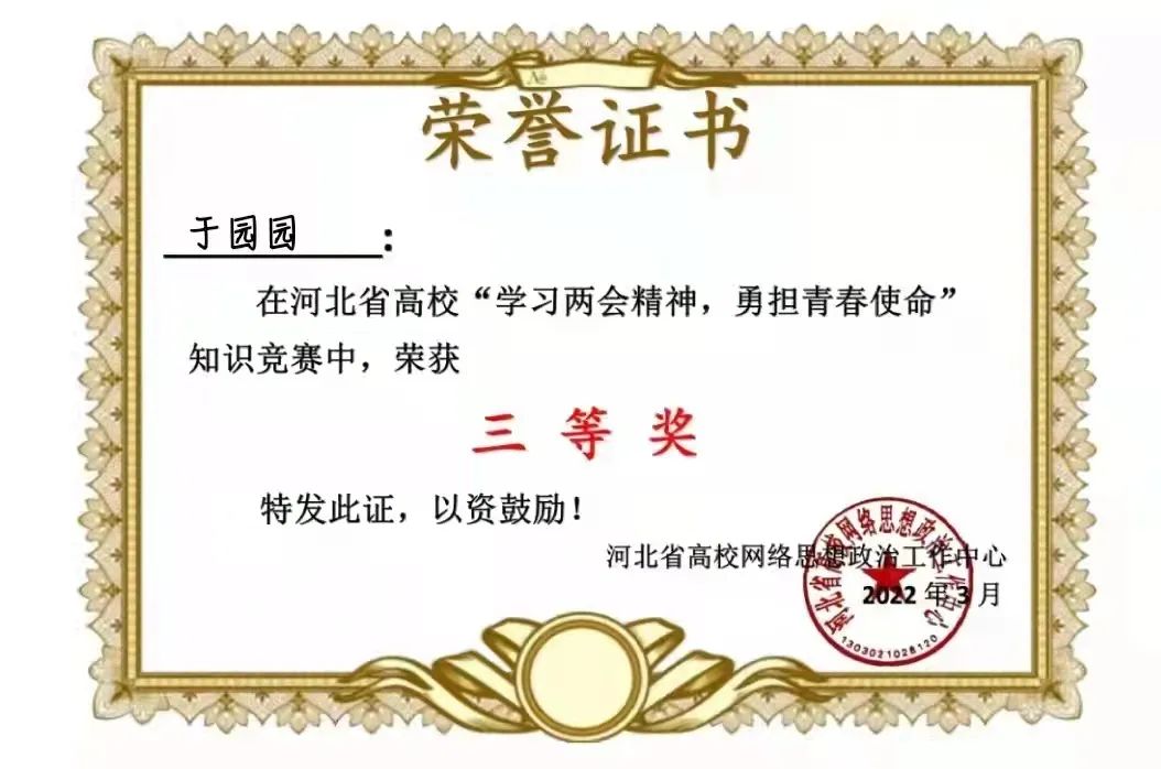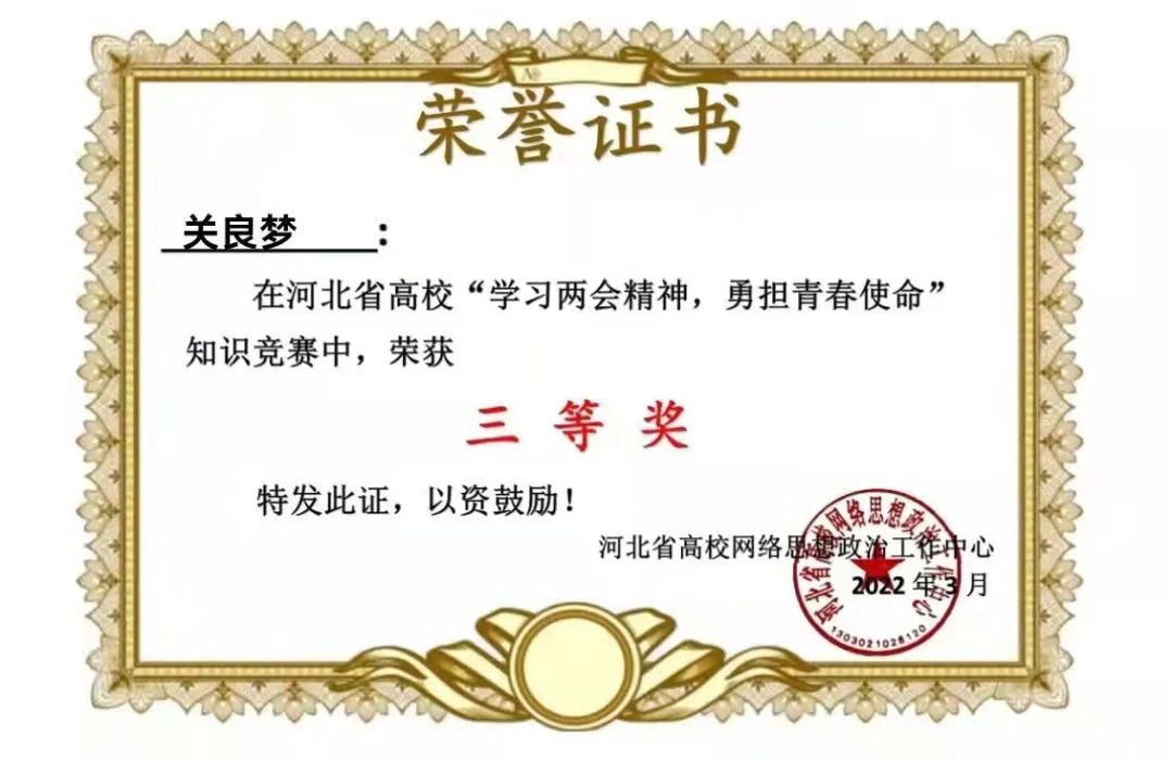 新葡萄官网在河北省“学习两会精神,勇担青春使命”知识竞赛中获得优秀组织奖,36名同学获得一等奖,199名同学获得二等奖,417名同学获得三等奖。