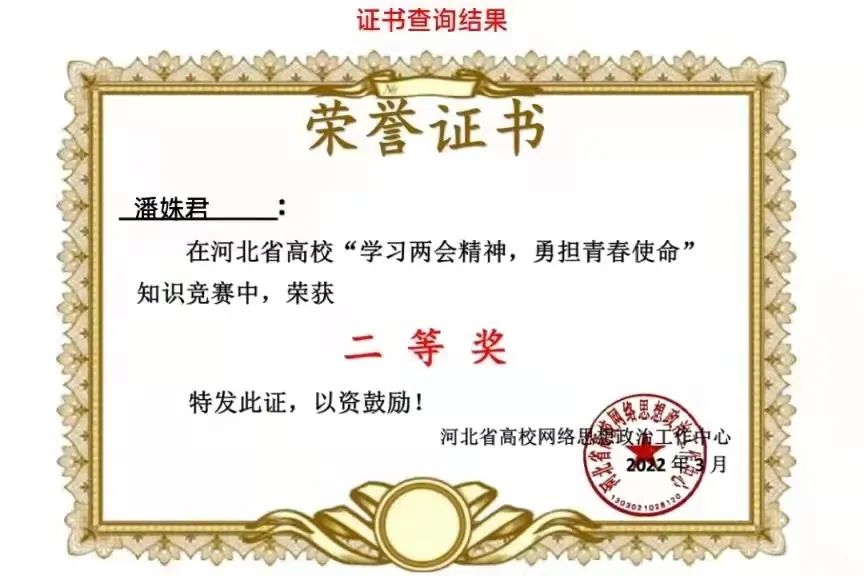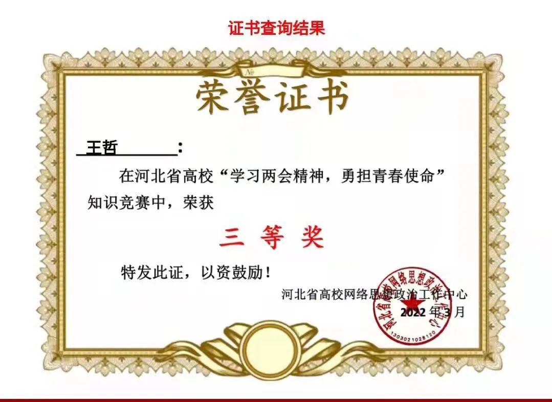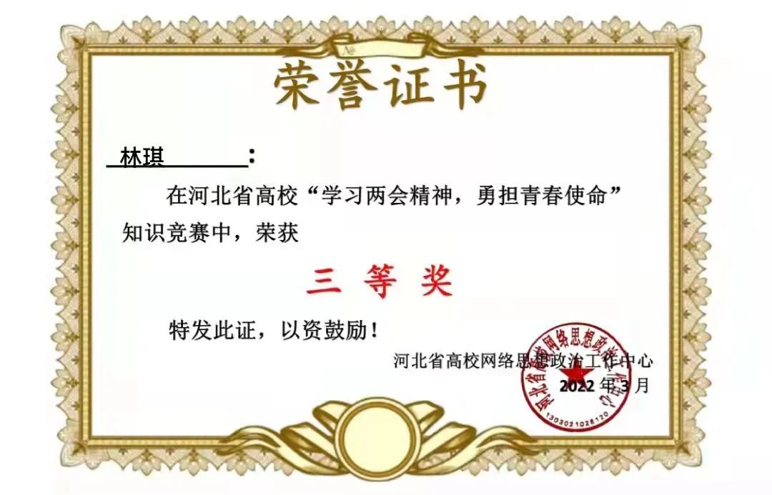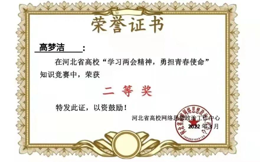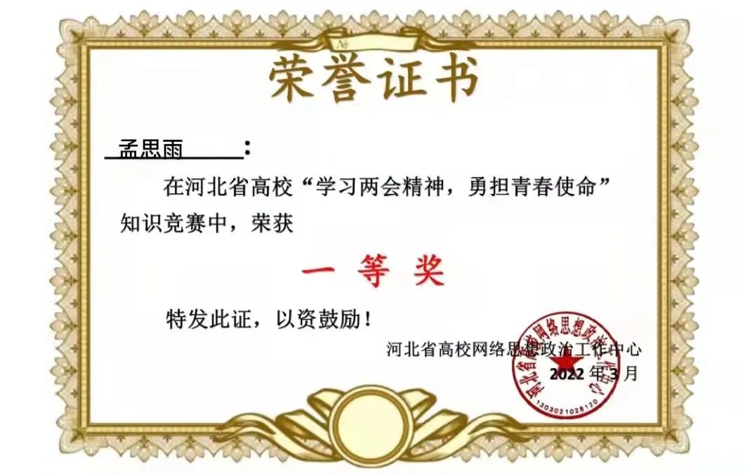 新葡萄官网在河北省“学习两会精神,勇担青春使命”知识竞赛中获得优秀组织奖,36名同学获得一等奖,199名同学获得二等奖,417名同学获得三等奖。