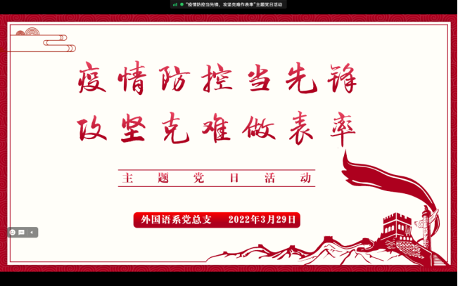 近日,外国语学院党总支在线上开展了“疫情防控当先锋,攻坚克难作表率”主题党日活动,进一步提高全体党员教师政治站位,强化风险意识,推动党史学习教育常态化长效化。