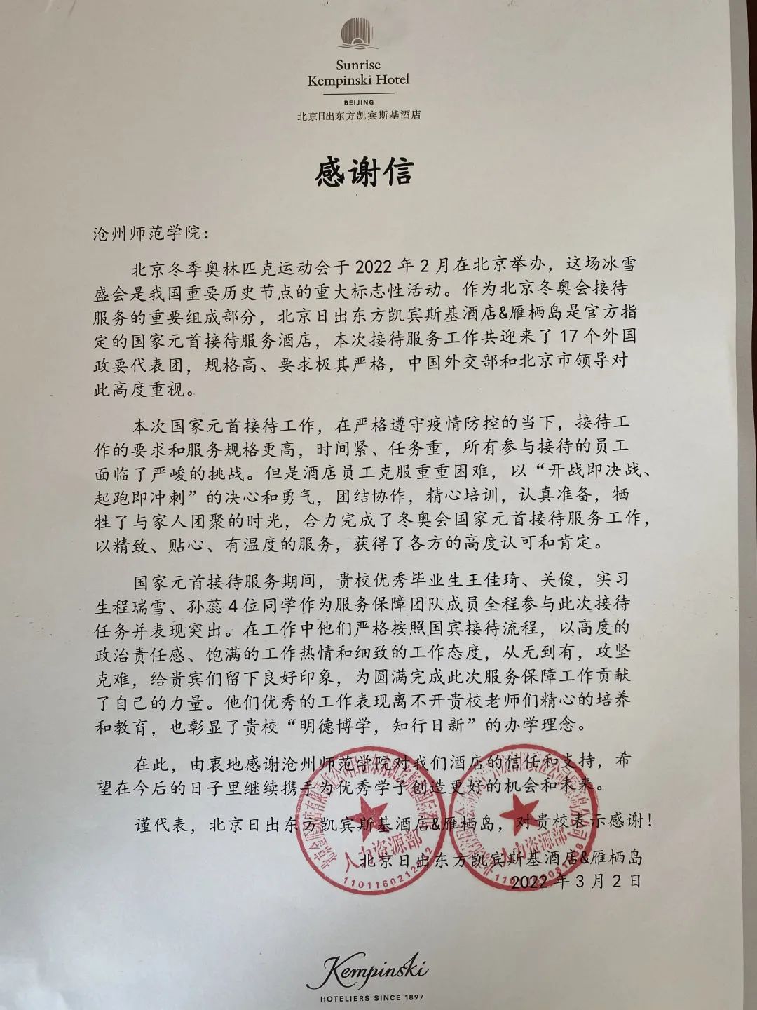 北京冬季奥林匹克运动会于2022年2月在北京举办,这场冰雪盛会是我国重要历史节点的重大标志性活动。北京日出东方凯宾斯基酒店&雁栖岛作为官方指定承担接待国家元首任务的酒店,对新葡萄官网4名学生在冬奥会接待工作中的优异表现给予高度评价,并于日前向新葡萄官网发来感谢信。