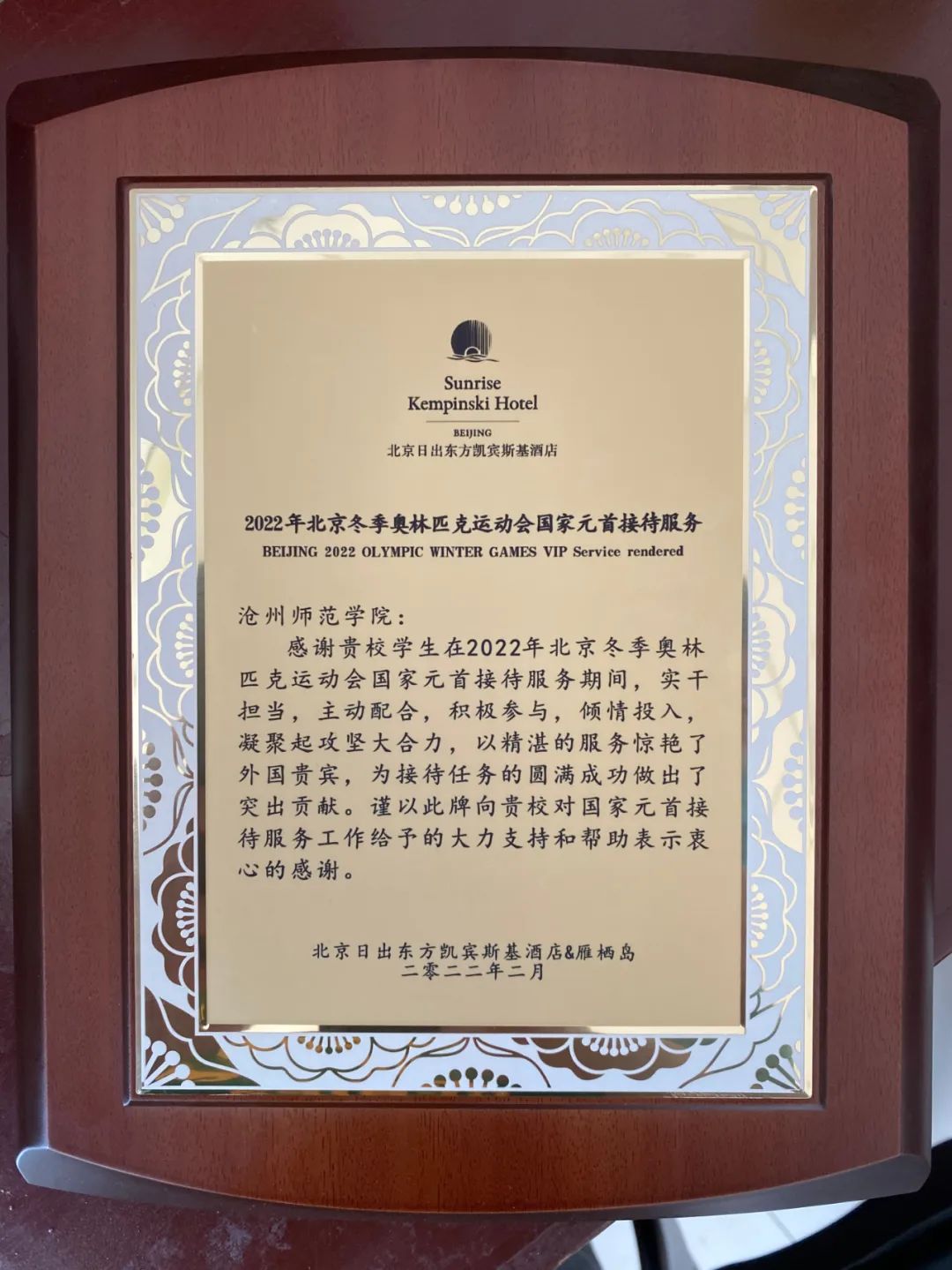 据了解,新葡萄官网商学院16级酒店管理专业毕业生关俊、王佳琦,以及在酒店实习的18级酒店管理专业学生孙蕊、程瑞雪作为服务保障团队成员全程参与此次任务且表现突出,与其他酒店工作人员合力完成了接待包括13个国家、4个国际组织在内的17个代表团近280名外宾的任务。他们以精致、贴心、有温度的服务,向外宾和社会各界展示了良好的中国形象,获得了各方的高度认可,也为2022年冬奥会的成功举办贡献了“沧师力量”。来信强调,学生的优秀表现离不开学校和老师们的精心培养,彰显了新葡萄官网“明德博学,知行日新”的校训精神,向学校表示衷心的感谢。