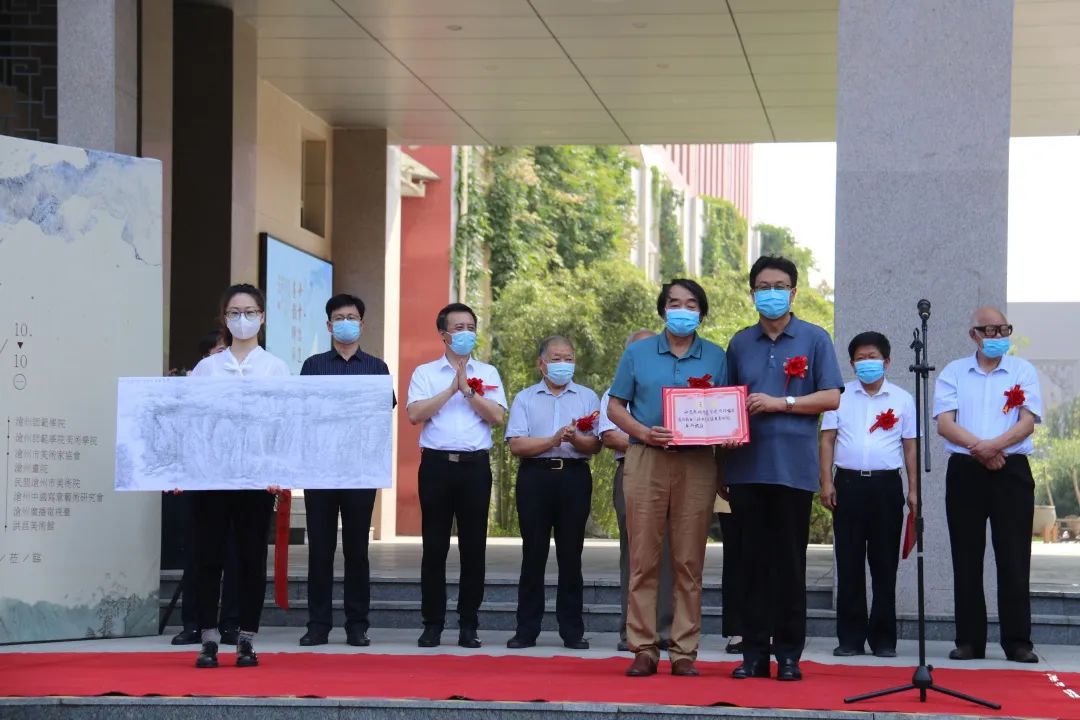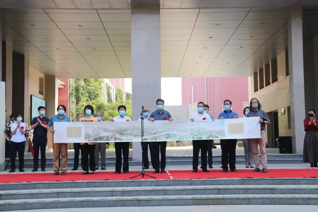 沧州市中国画写意艺术研究会精选出《大运沧州盛景图》《沧海巨变图》《砥柱中流-红色基因》三幅巨幅优秀画作珍藏卷轴,由王君和董振怀作为代表将卷轴捐赠新葡萄官网,云电军、姜忠明、高颖、周振平、范小振代表学校接受画作。云电军为王君颁发收藏证书。