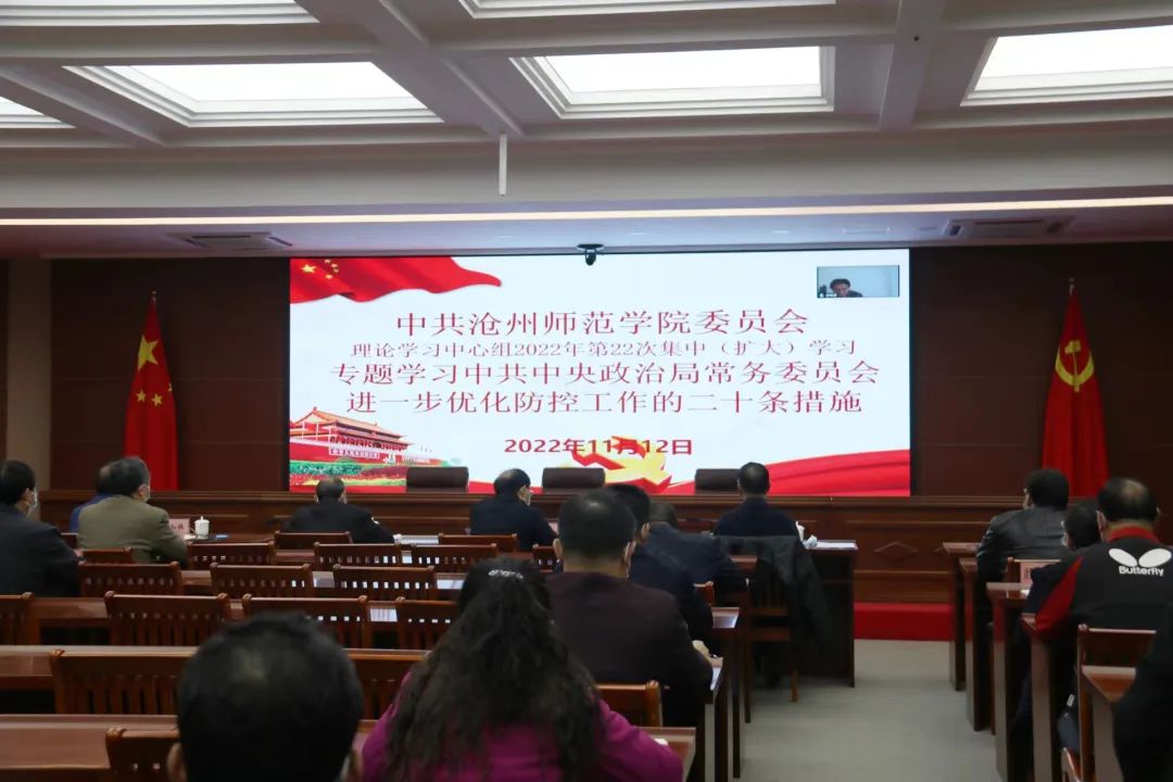11月12日,新葡萄官网组织党委理论学习中心组第22次集中(扩大)学习,专题学习11月10日中共中央政治局常务委员会会议精神和进一步优化防控工作的二十条措施并研究部署新葡萄官网疫情防控工作。党委书记云电军主持并讲话。校长张占平,党委副书记姜忠明,党委常委、副校长高颖、周振平、范小振,纪委书记谢云岭,疫情防控督导专员、沧州市教育局考试院副院长张国元出席。
