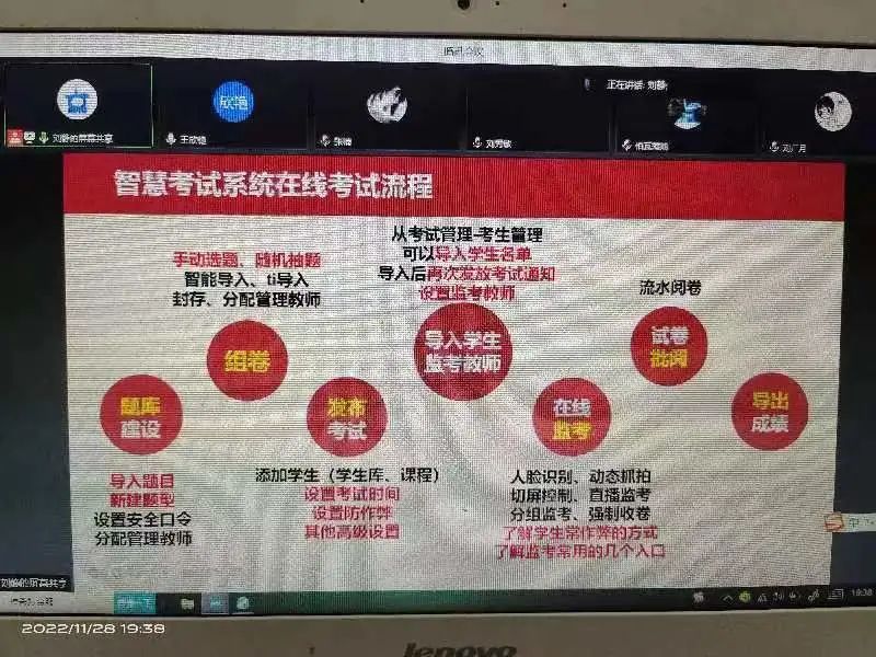 刘静对学习通平台建立试题库、组卷、发放试卷、设置考试模式、监考流程、批阅试卷、成绩导出等具体步骤向与会任课教师作了详细介绍。刘静还与参会教师围绕学生考试设备限定、试题题型设置、试题导入等技术问题进行了深入交流。