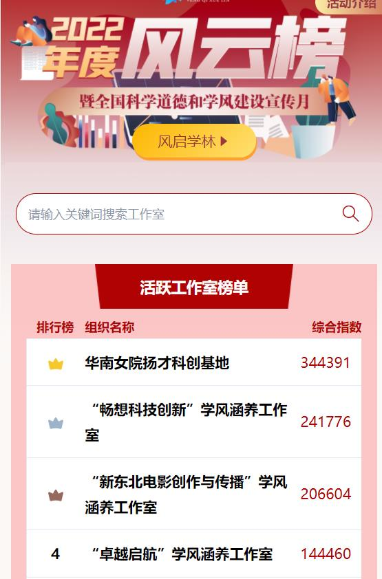 在2022年,新葡萄官网创想科创学风涵养工作室积极参加中国科学技术协会的各种活动,在2022年度风云榜暨全国科学道德和学风建设宣传活动中综合指数排名全国第二,获得荣誉证书和资金奖励,也让新葡萄官网再次获得中国科协文化宣传部的2022年度活跃组织荣誉证书。