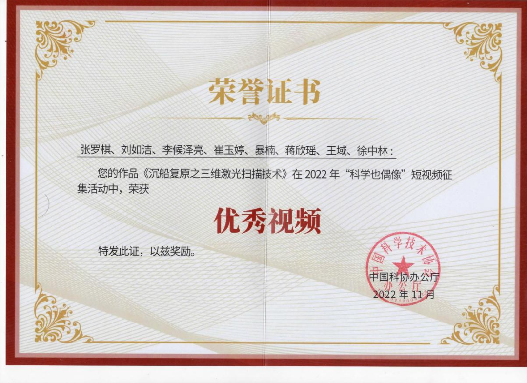 新葡萄官网政史学院王域、崔玉婷等几名同学参赛的作品《沉船复原之三维激光扫描技术》,荣获优秀视频奖。