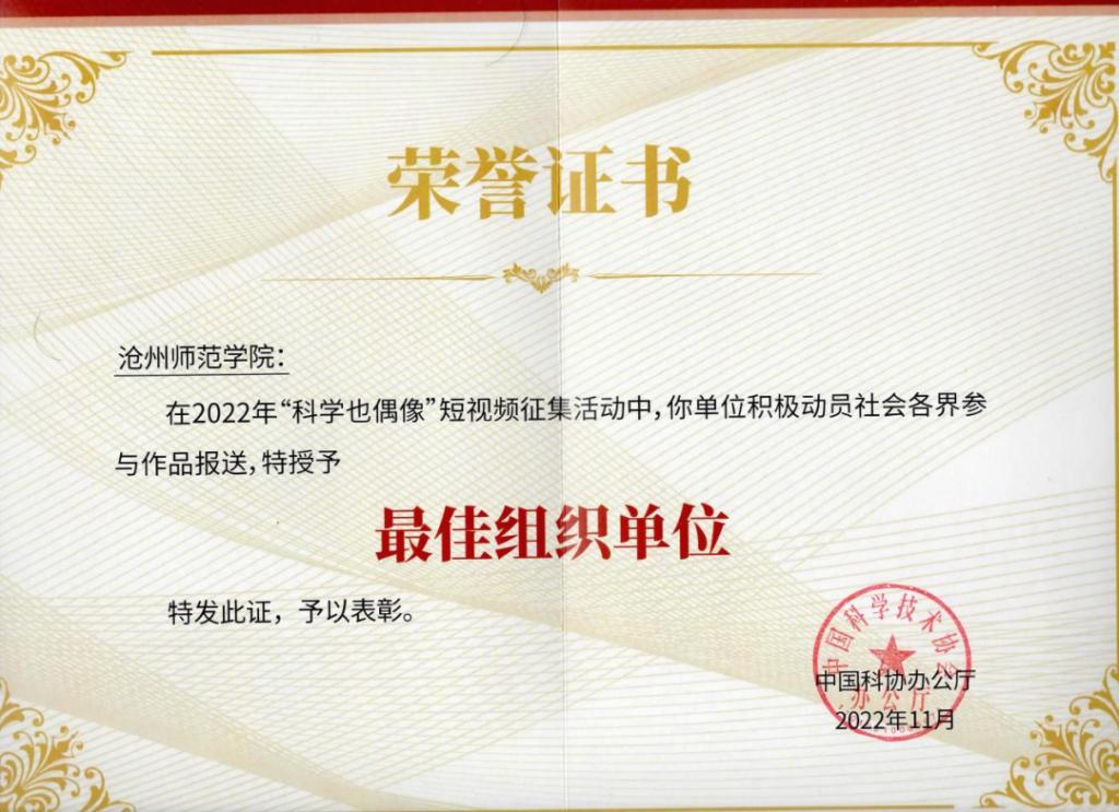 新葡萄官网科研处支持下的畅想科创-学风涵养工作室,在本次活动中提交了五部作品,在徐中林老师的指导下,有四部作品入围决赛前100名,在数千部参赛作品中大比例入围的表现尤为亮眼。因此新葡萄官网荣获中科协办公厅颁发的优秀组织单位奖。