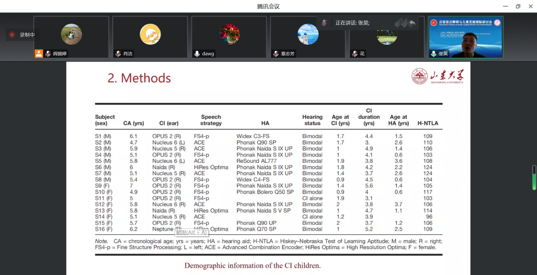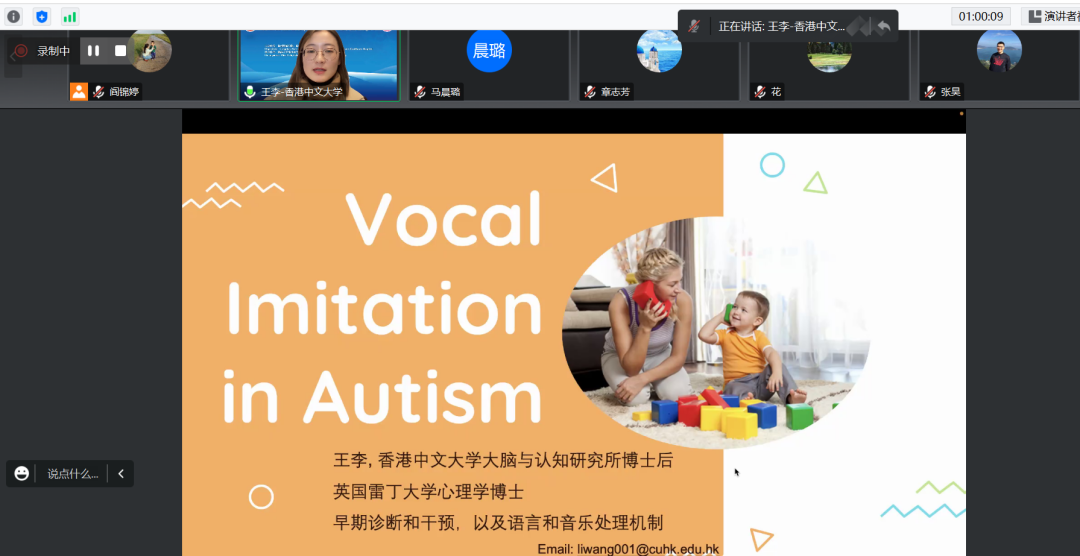 山东大学副研究员张昊、复旦大学副研究员徐坤宇、香港中文大学博士后王李、北京语言大学主管康复治疗师章志芳、湖南大学博士后郭承禹、中日友好医院主管语言治疗师葛丽君、华东师范大学物理治疗师瞿璐、日本筑波大学博士黄金峰、新葡萄8883官网AMG副教授阎锦婷共9位青年讲者,从不同的方面和各自专业的角度,分析了语言障碍儿童的言语行为,探索了异常语言现象的病理机制。