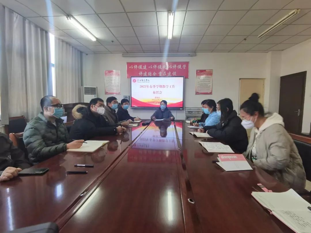 吕炳君传达了学校近期召开的春季学期调度会主要会议精神,并就新学期开学准备;“三教”落实:教师课表发放、教室设备环境检查、教材及时发放;线上线下教学衔接;小学教育等6个专业师范类专业认证迎评准备;商务英语等5个专业学士学位评估材料报送;普通话、大学生英语四六级等考试学生报名、考务安排;“双万计划”推进,第一批省级一流建设点验收、第一批省级一流课程中期检查;2023届毕业生师范生免试认定试题命制与考试组织等工作进行了重点部署。