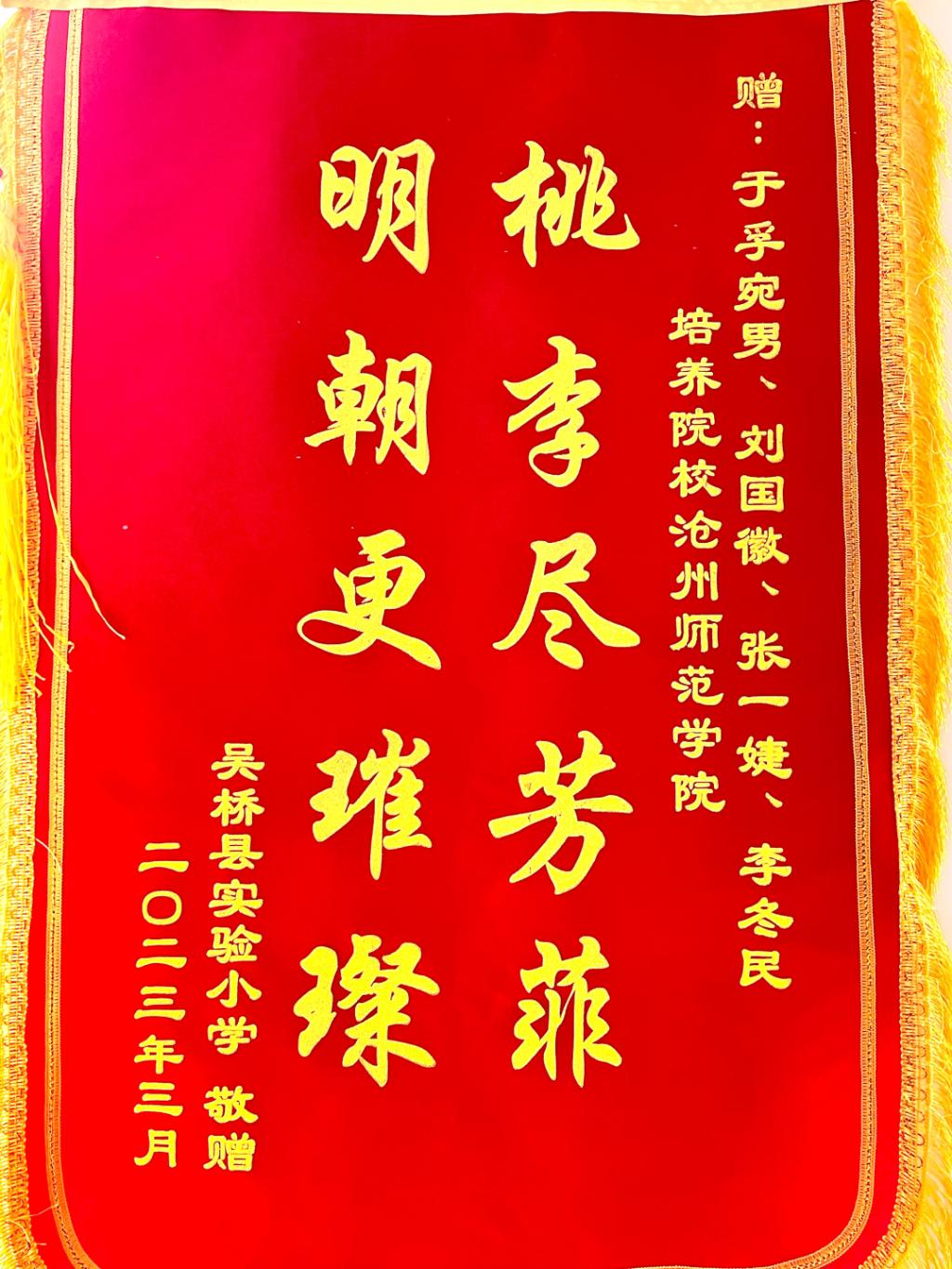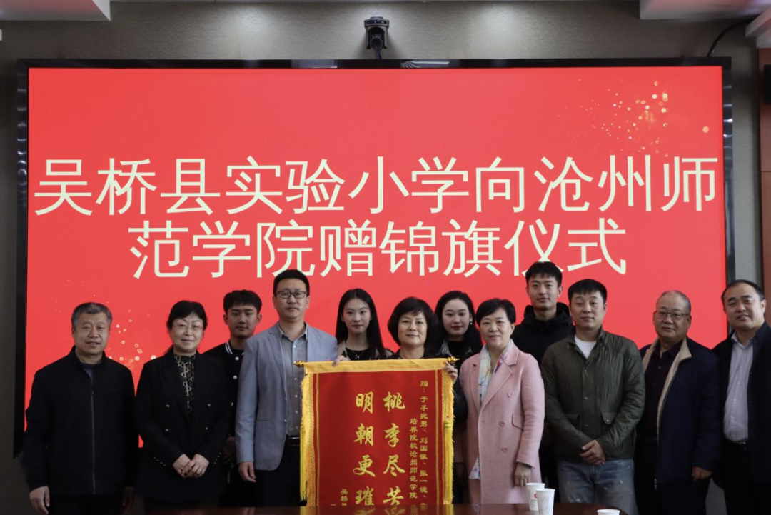 3月7日上午,吴桥县实验小学校长刘建、后勤主任崔根立一行,向新葡萄官网送来锦旗,感谢新葡萄官网学生于孚宛男、刘国徽、张一婕、李冬民在实习期间的勤恳工作。党委常委、副校长高颖代表学校接受了锦旗。