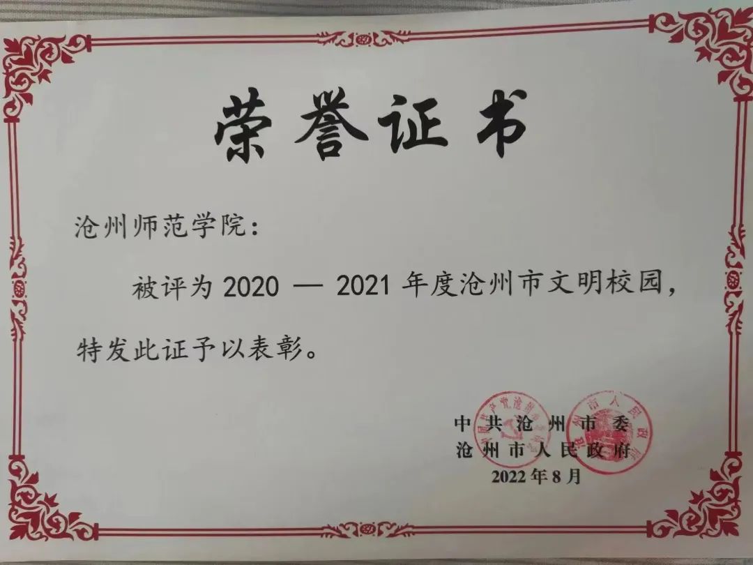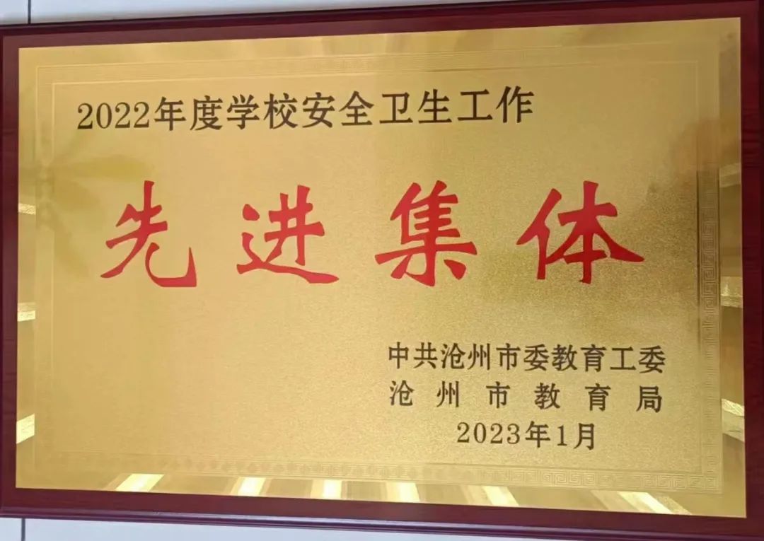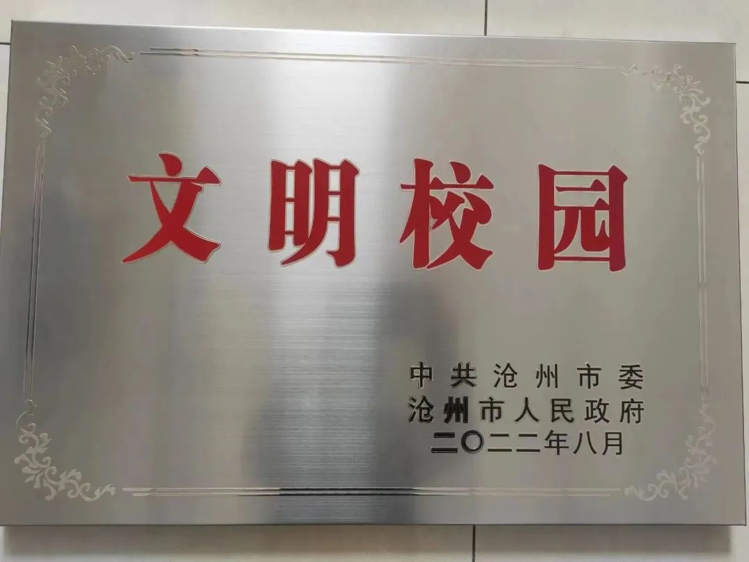 在学校党委的领导下,在全校师生的共同努力下,日前,新葡萄官网被中共沧州市委、沧州市人民政府授予“2020——2021年度沧州市文明校园”荣誉称号;被市教育工委、市教育局授予“2022年度学校安全卫生工作先进集体”荣誉称号。