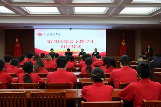 校教务处处长吕炳君主持出征仪式。马克思主义学院、文学院、外国语学院、政史学院、数学与统计学院、音乐学院、美术学院、教育学院等援疆学生派出单位以及教务处、学生处、党政办、宣传部等部门负责人集体欢送援疆同学们。