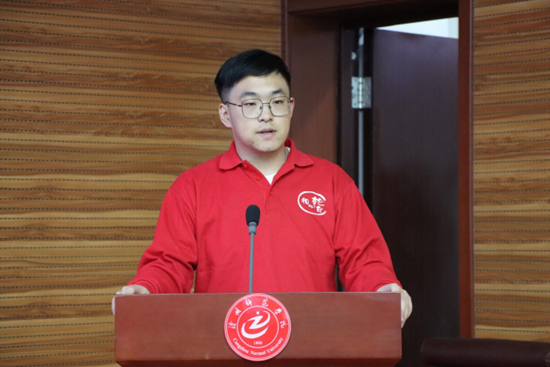 文学院张名昭代表援疆同学发言。他说道,援疆支教不仅是一项神圣的工作任务,而且是心向往之的一段旅程。青春年华能够有这样一段经历,紧跟党的步伐,紧跟时代理念,是无上的荣誉,必将倍加珍惜。他代表援疆同学表态,将发扬吃苦耐劳精神,时刻保持崇高的理想信念,不断丰富知识,涵养教育情怀,提升教学本领,坚定维护民族团结和祖国统一,热爱新疆发展新疆。真正做到“在新疆一天,守一天热土,做一天祖国教育守边的好战士!”