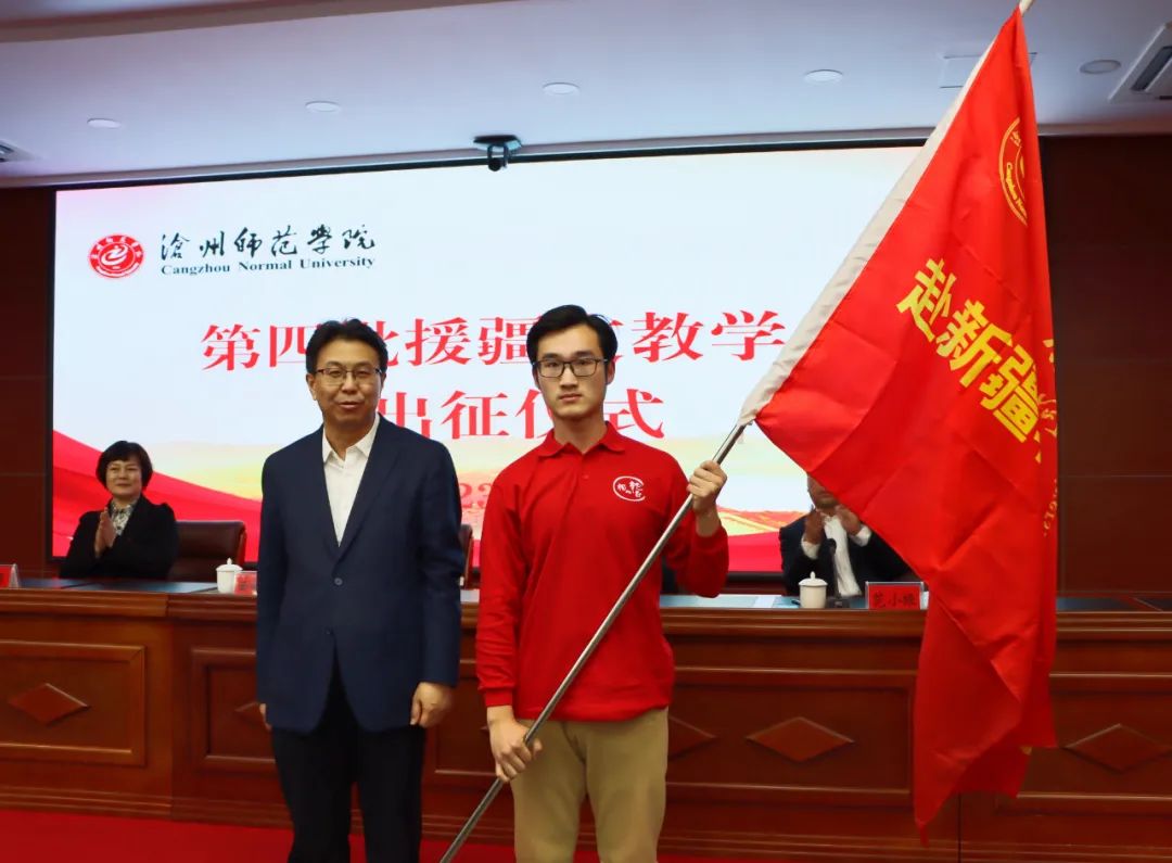云电军为援疆支教小分队授旗。接过援疆的旗帜,34名青年学子扛起了为人师表、奉献边疆的重任,到基层和人民中去建功立业,让青春之花绽放在祖国最需要的地方。