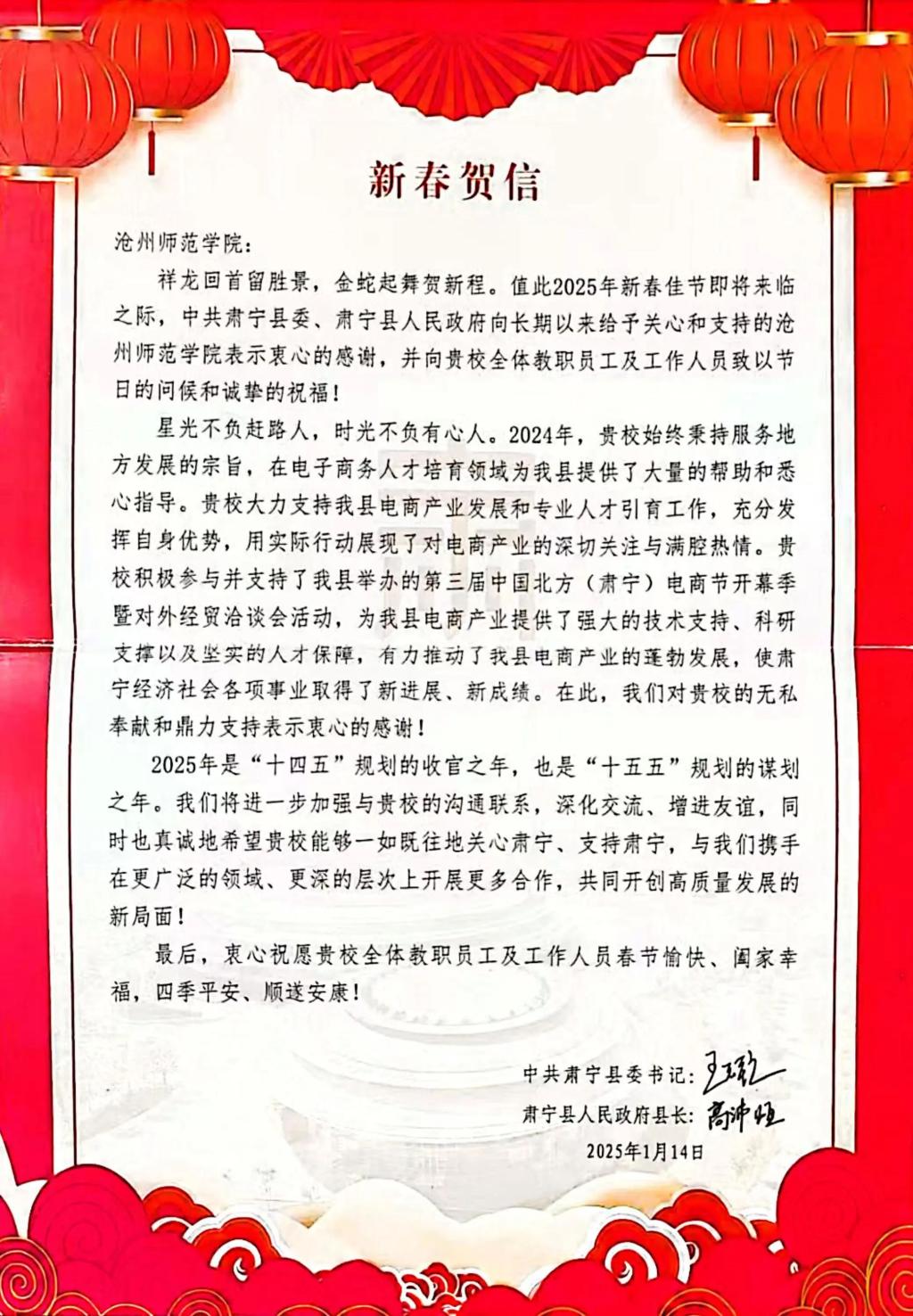神龙回首留盛景,金蛇起舞贺新程。新春佳节来临之际,新葡萄官网收到了中共肃宁县委、肃宁县人民政府发来的新春贺信,信中对新葡萄官网在电子商务人才培育领域提供的帮助指导予以感谢,对新葡萄官网积极参与并支持第三届中国北方(肃宁)电商节开幕季暨对外经贸洽谈会活动表达感激,对新葡萄官网服务地方、助力县域经济发展给予高度肯定。信中还表达了与新葡萄官网进一步开展更广泛领域、更深层次合作的美好愿景。