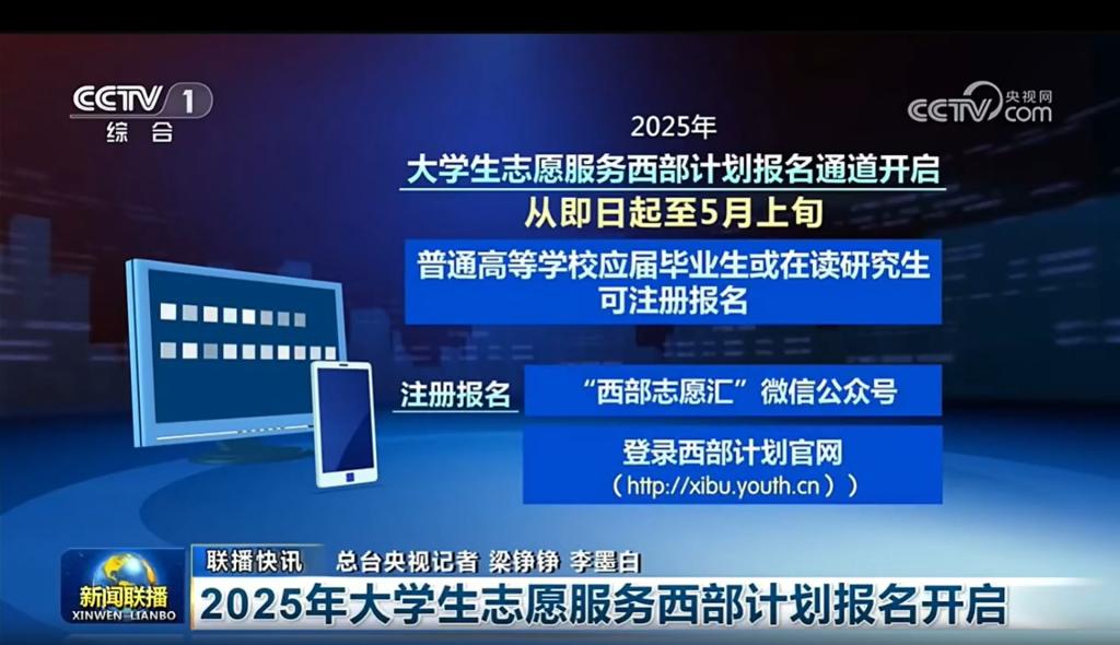 即日起至5月上旬,2025年普通高等学校应届毕业生或在读研究生,可通过微信公众号“西部志愿汇”(菜单栏中的“我要报名”)或登录西部计划官方网站(http://xibu.youth.cn),在西部计划报名系统中注册报名。