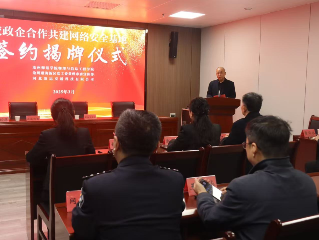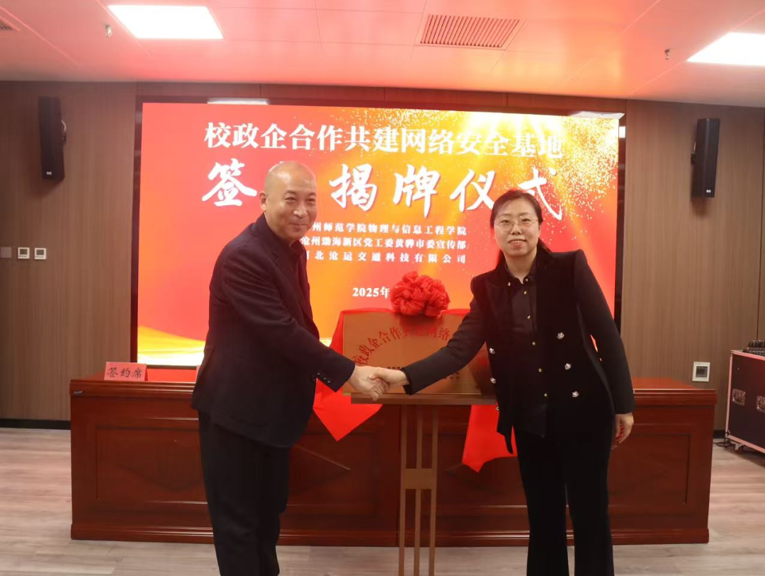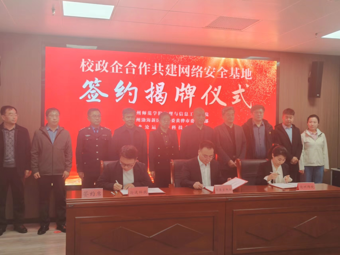 为促进区域网络安全防护水平进阶,推动产学研深度融合,新葡萄官网物理与信息工程学院、渤海新区党工委黄骅市委宣传部以及沧运交通科技有限公司三方本着资源共享、优势互补、协作共赢的原则开展“校政企合作共建网络安全基地”项目,并于3月13日举行了签约揭牌仪式。三方将充分利用各自的师资、研发、市场、监管等优势,实现资源和信息的高效整合,为渤海新区黄骅市的网络安全保障提供强有力的技术支撑,为新葡萄官网和沧运科技公司提供人才锻炼、技能提升的实践平台。